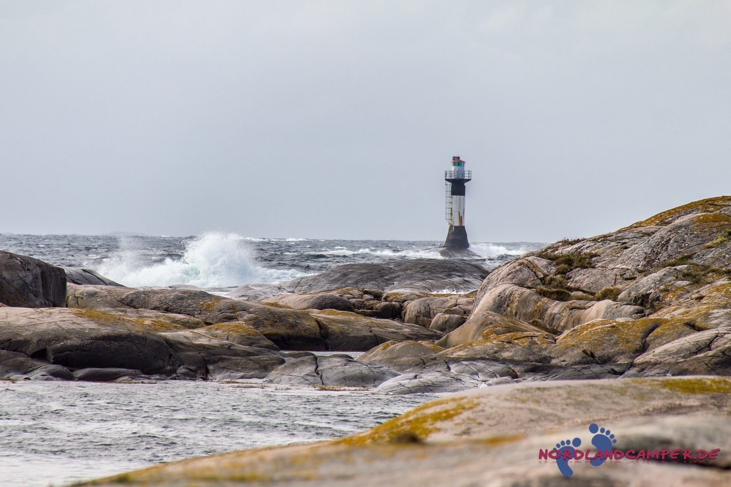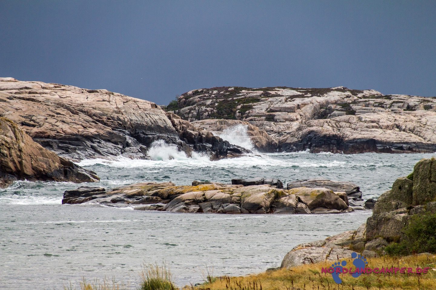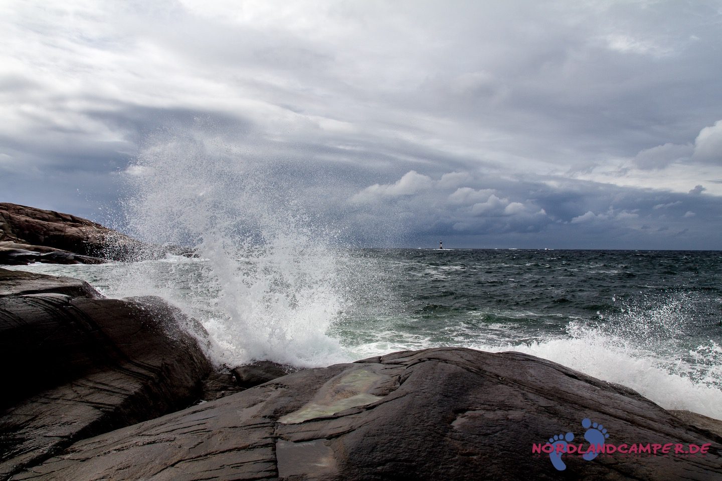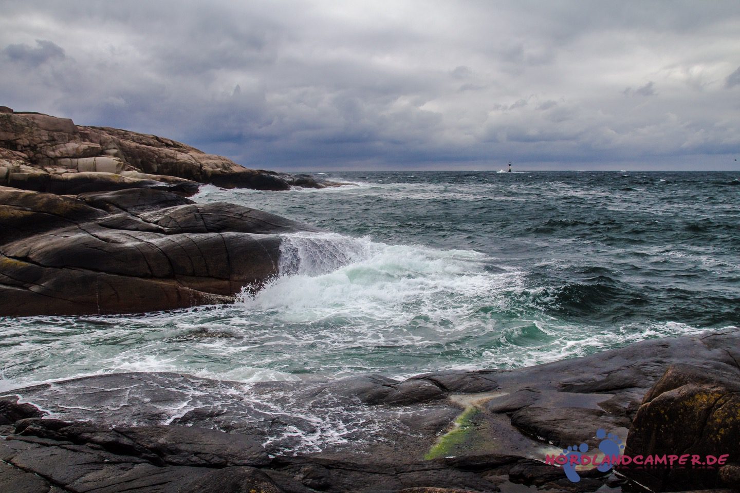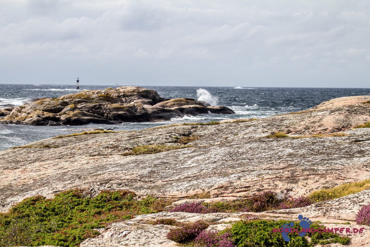 Heute steht eine Wanderung ins Naturreservat auf dem Programm. Wir freuen uns auf die reizvolle Schärenlandschaft, die uns erwartet. Ein kleiner Parkplatz etwa einen Kilometer westlich des Platzes ist unser Ausgangspunkt. Durch ein Wäldchen schlängelt sich ein Kiesweg in die Schären des Naturreservats. Der Wind pfeift uns um die Ohren und unheilvolle dunkle Wolken ziehen am Horizont auf uns zu. Brecher klatschen auf die glatt geschliffenen Felsen, in der Ferne trotzt ein Leuchtturm den Gewalten der Natur. Wir lieben genau diese Stimmung in Bohuslän, die so viel imposanter als Sonnenschein und blauer Himmel ist! In einem kleinen Hafen schaukeln Boote gemütlich in der Dühnung.