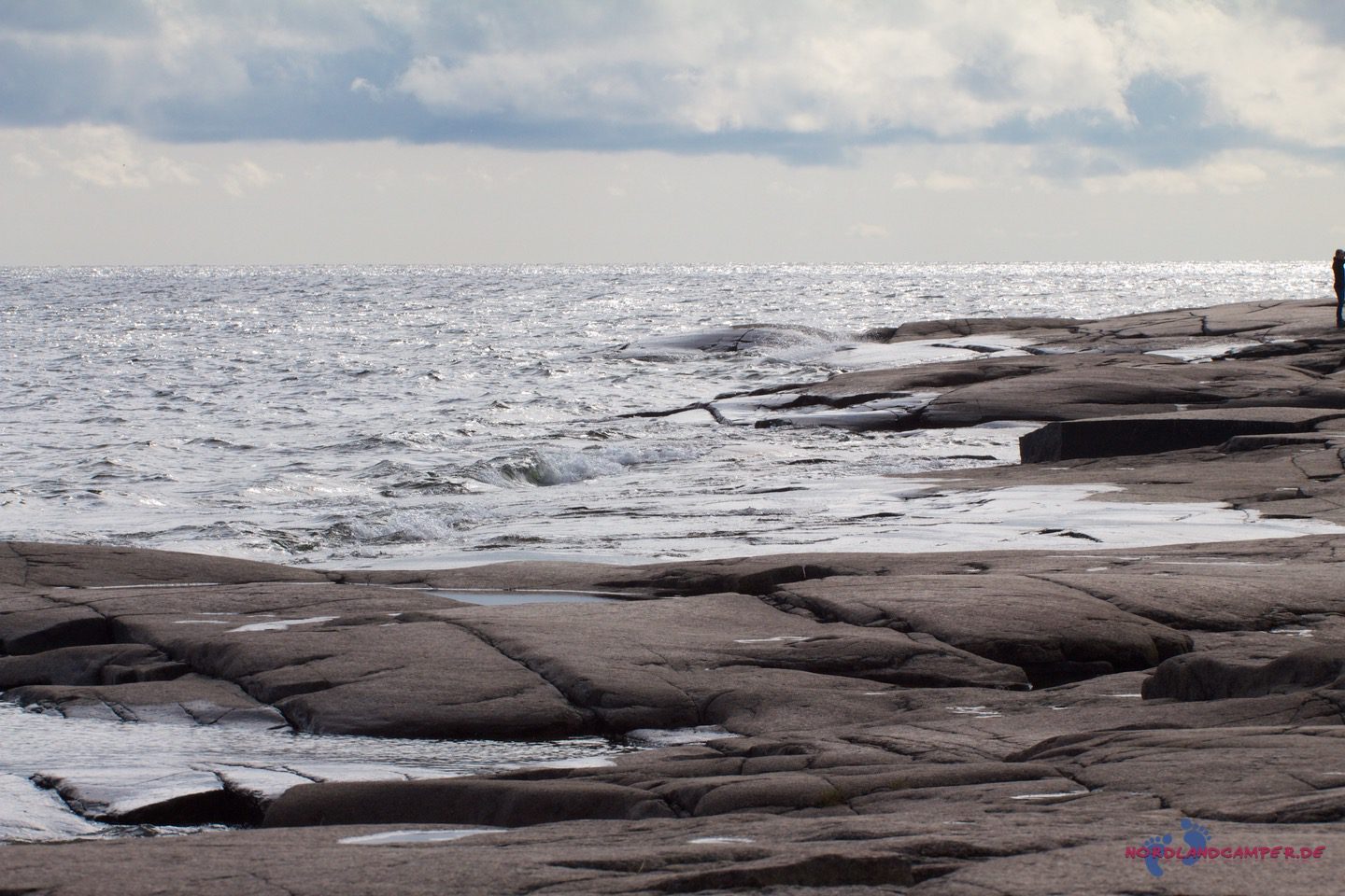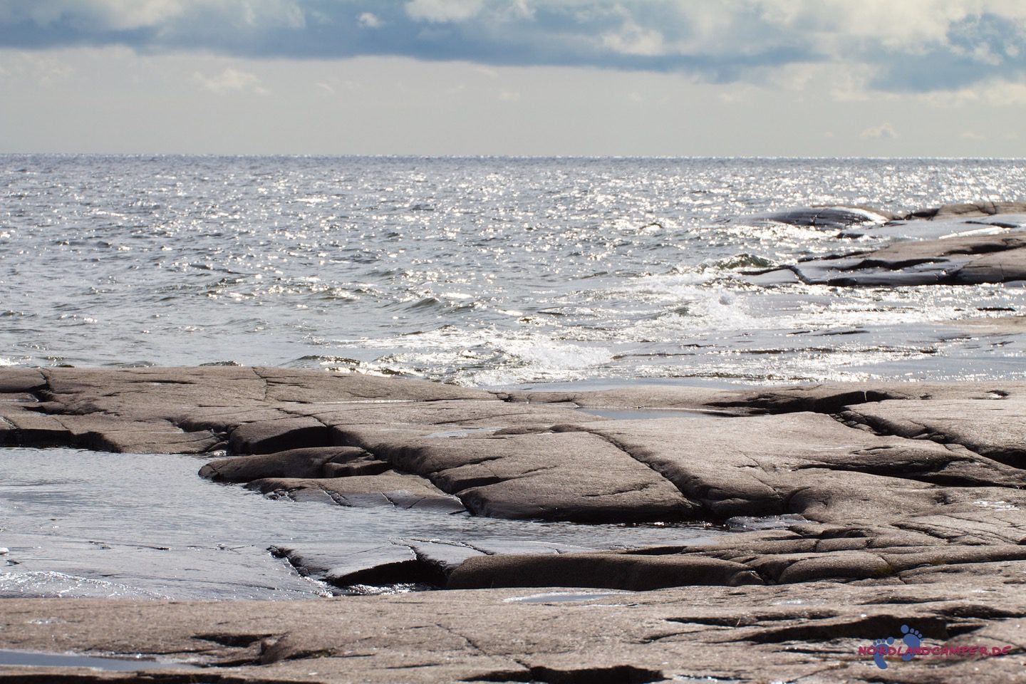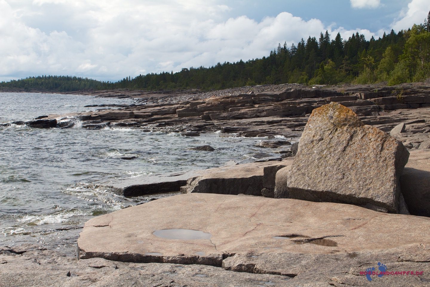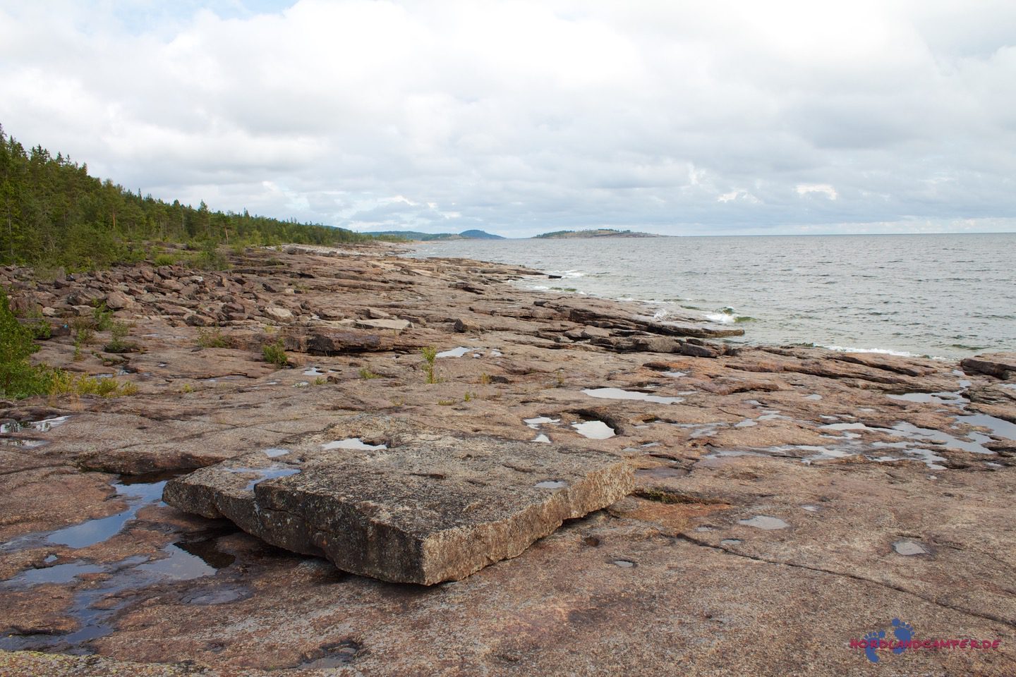 Die hübschen flachen rotbraunen Steine bieten tolle Fotomotive. Bei schönem Wetter kann man sicher schön baden. Einen Küstenabschnitt grober Steine kann man etwas oberhalb über einen Pfad am Waldrand umgehen. Wandert man die Küste etwas weiter, erreicht man eine Grillstelle die zur Brotzeit einläd. Grillmaterial muss aber mitgebracht werden.