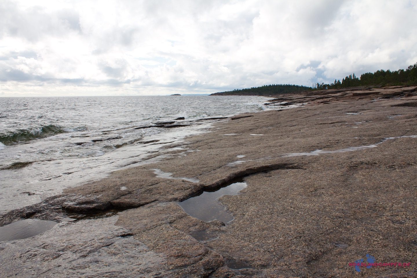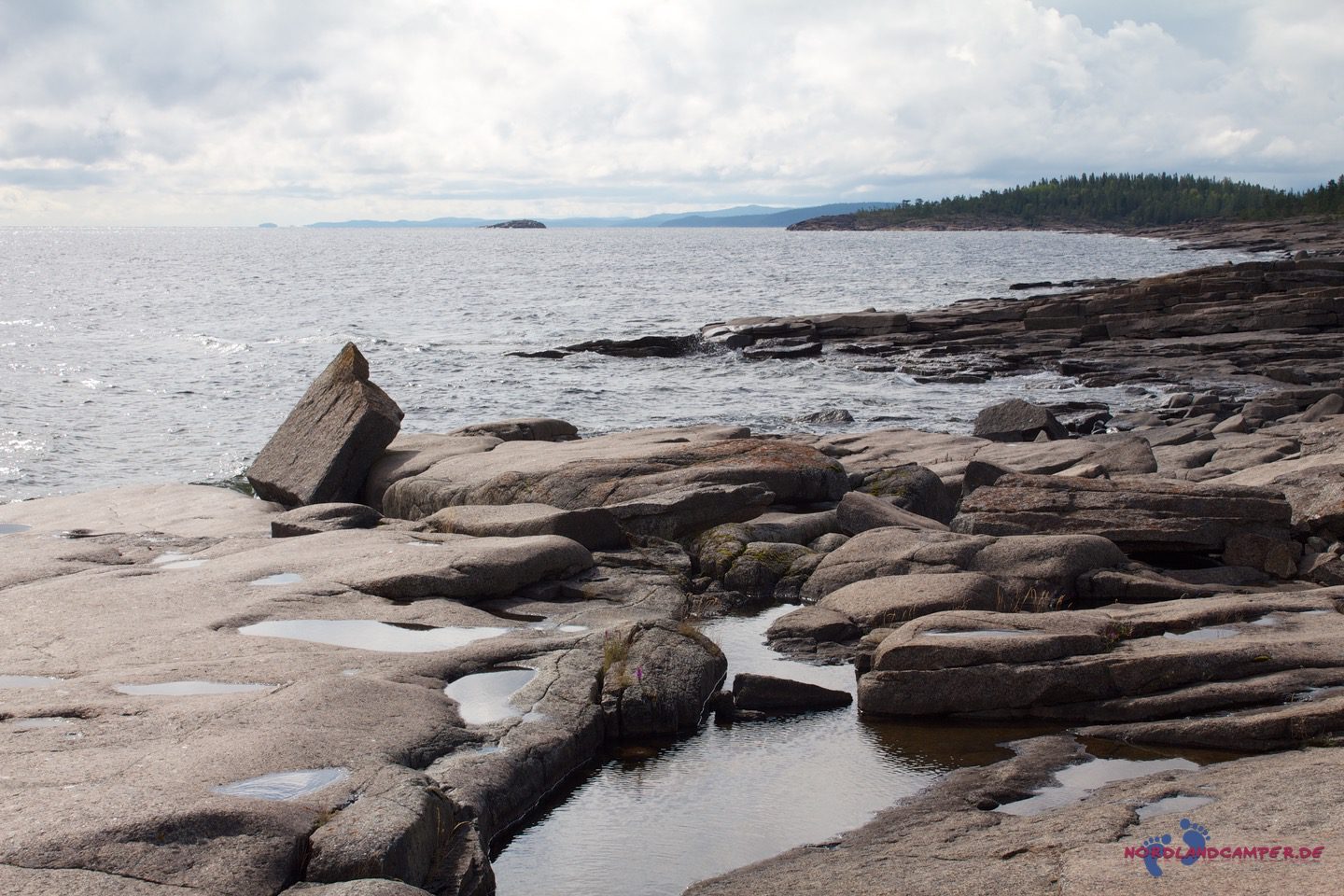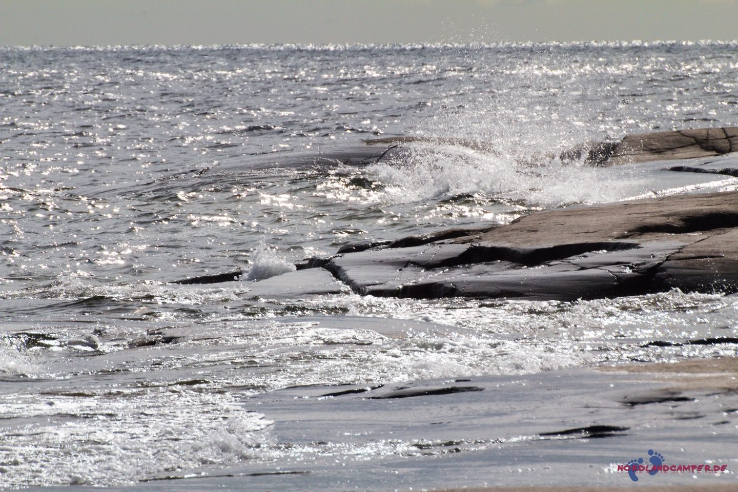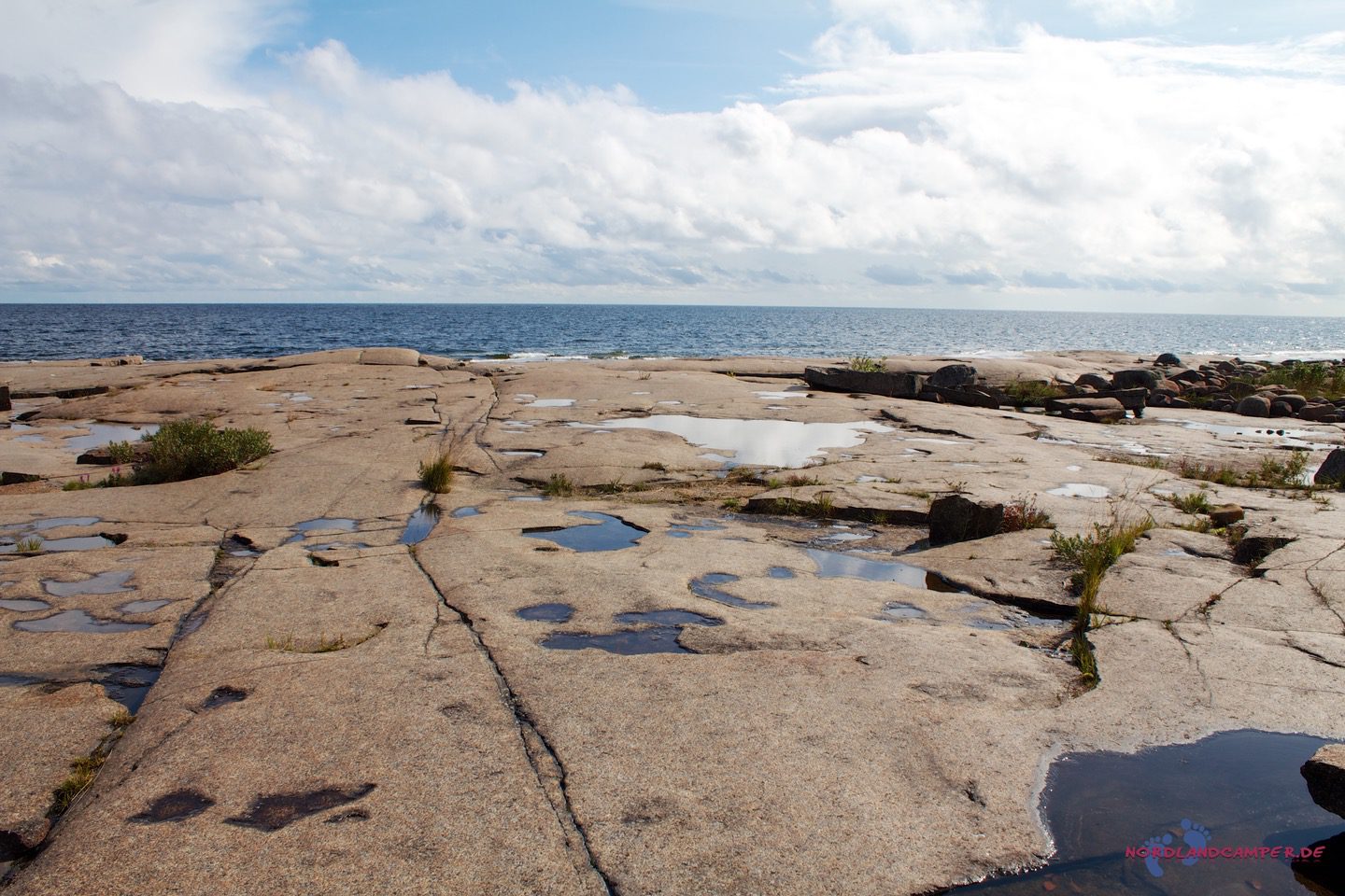 Die hübschen flachen rotbraunen Steine bieten tolle Fotomotive. Bei schönem Wetter kann man sicher schön baden. Einen Küstenabschnitt grober Steine kann man etwas oberhalb über einen Pfad am Waldrand umgehen. Wandert man die Küste etwas weiter, erreicht man eine Grillstelle die zur Brotzeit einläd. Grillmaterial muss aber mitgebracht werden.