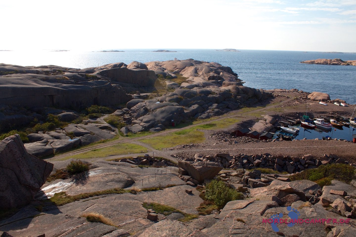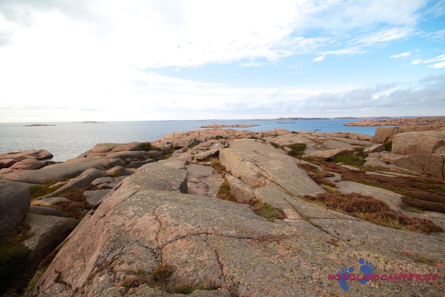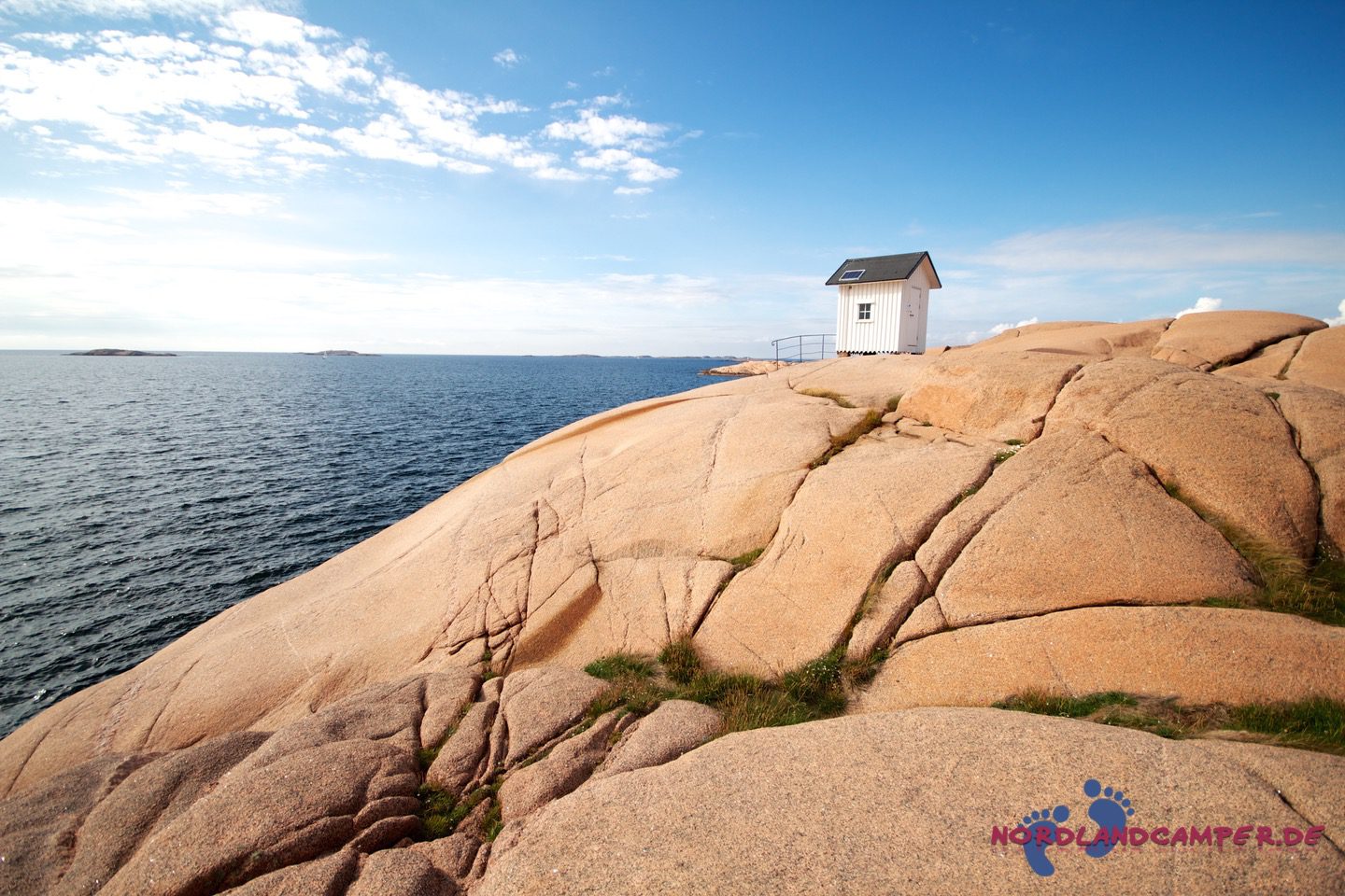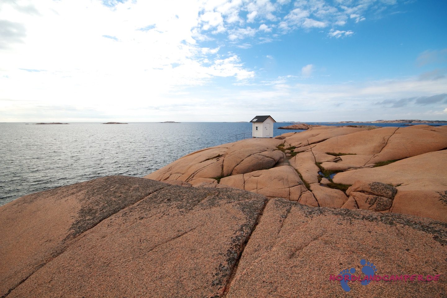 Hier starten die für Bohuslän so typischen, von Wind, Wetter und Gletschereis abgeschliffenen Schärenfelsen, die im Licht der Abendsonne herrlich rot-golden leuchten. Besonders eindrucksvoll ist die Wanderung an windigen Tagen, wenn der Sturm das Meer aufpeitscht und große Wellen an die Schären anbranden. Die Mitnahme von regenfester Kleidung und eines sturmtauglichen Regenschirms ist bei zweifelhaftem Wetter sehr zu empfehlen, da es unterwegs keine Möglichkeit zum Unterstand gibt und ein Regenguss auf den Schären sehr ungemütlich werden kann (aus eigener Erfahrung…). Über die Schärenfelsen erreicht man unkompliziert ein kleines weißes Häuschen in aussichtsreicher Umgebung, das wunderbar als Fotomotiv aus allen Himmelsrichtungen herhalten kann.