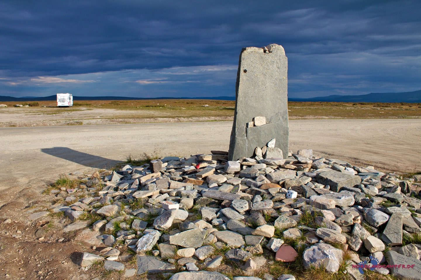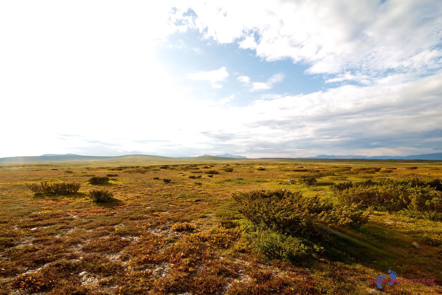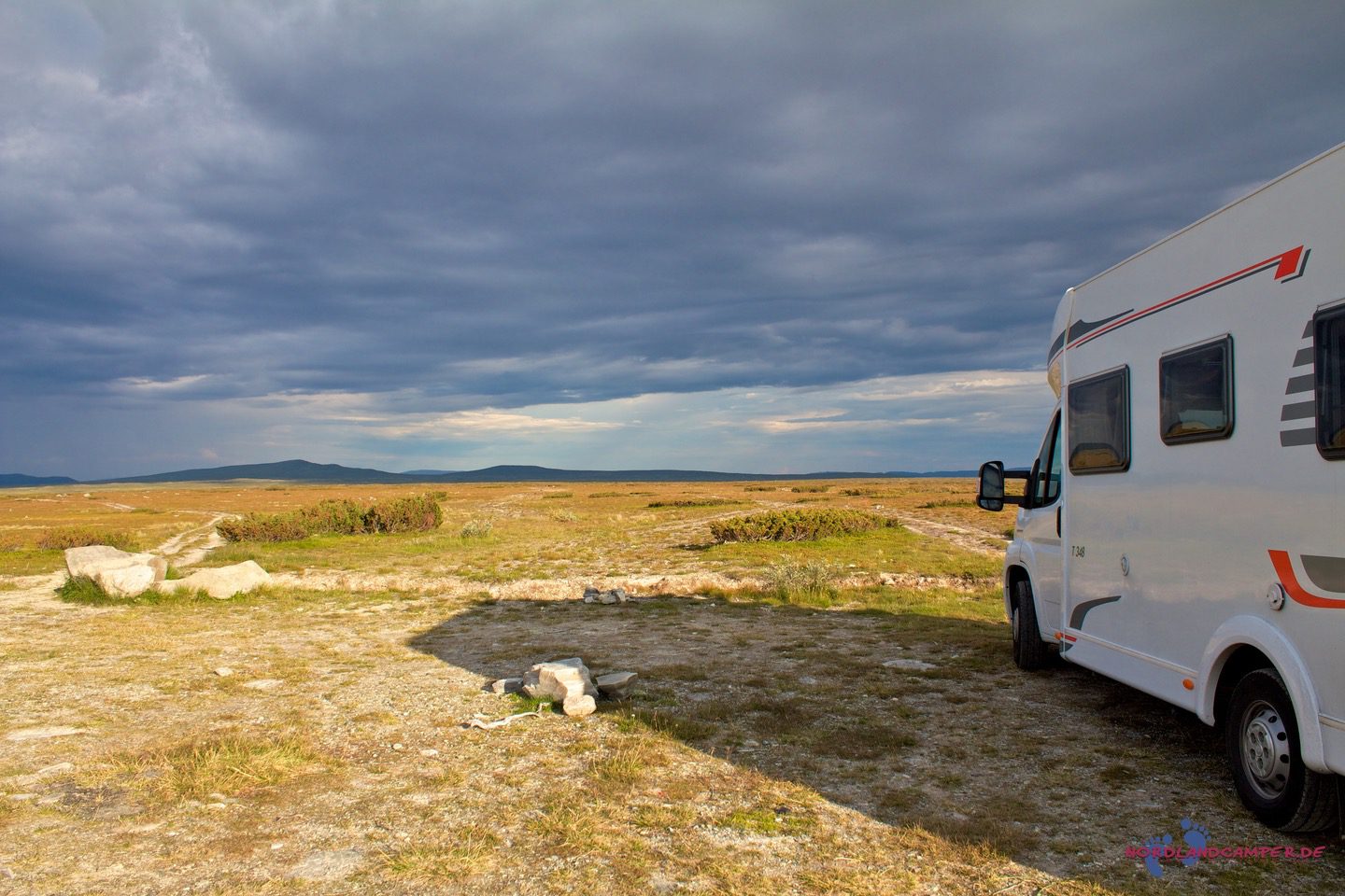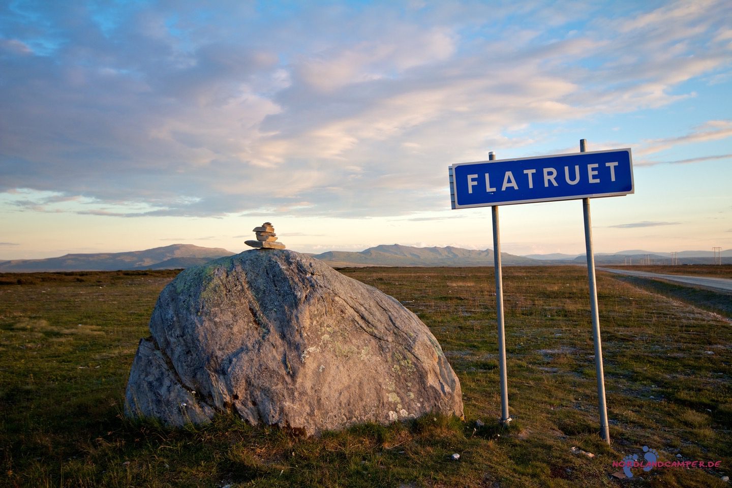Ist man erstmal auf der Passhöhe angekommen, wird die Straßenqualität besser. Insgesamt muss man mit knapp 40 Kilometern „Rumpelpiste“ rechnen, bis die Reifen wieder Asphalt unter sich haben. Die Aussicht ist gigantisch und reicht bis zum Horizont. In seiner Kargheit ist dieser Flecken Natur extrem einladend. Nach einigen Kilometern auf Passhöhe erreicht man die Mitte des Flatruetvägen, der durch einen großen Gedenkstein und einen entsprechenden Parkplatz markiert ist. Hier ist der optimale Platz zum Übernachten! Wenn das Wetter schlecht ist, pfeift der Wind gehörig um das Wohnmobil und der Regen prasselt stramm aufs Dach. Auf dem weiten Hochplateau gibt es nichts, was dem Wind etwas entgegensetzen kann. Bei Mistwetter sollte man sich also die Fahrt hier hinauf gut überlegen.