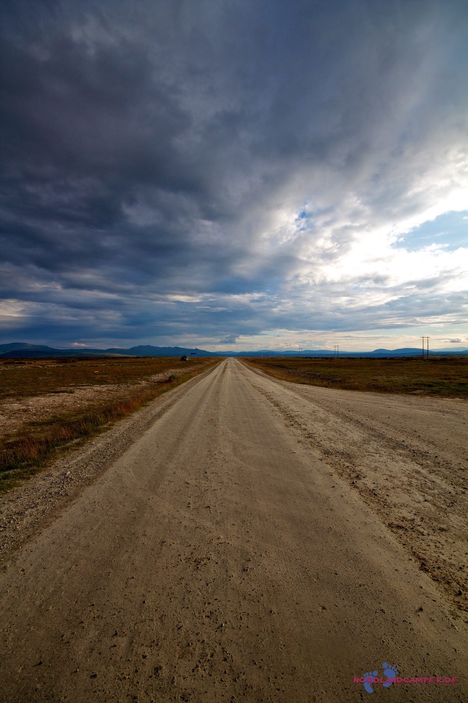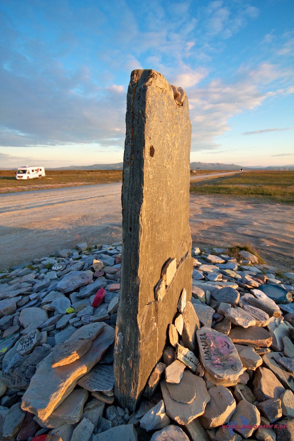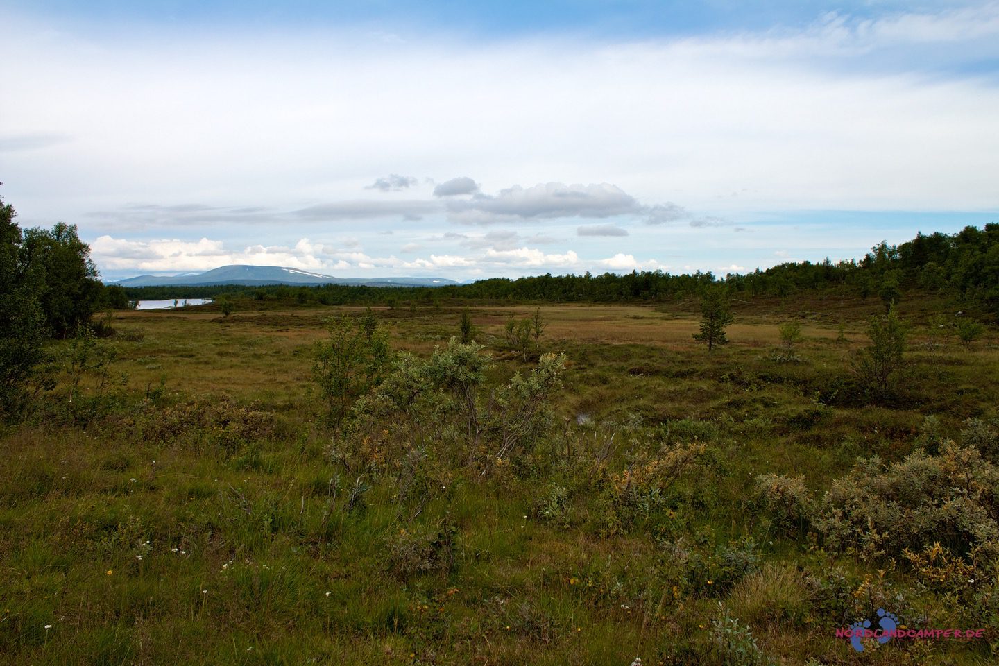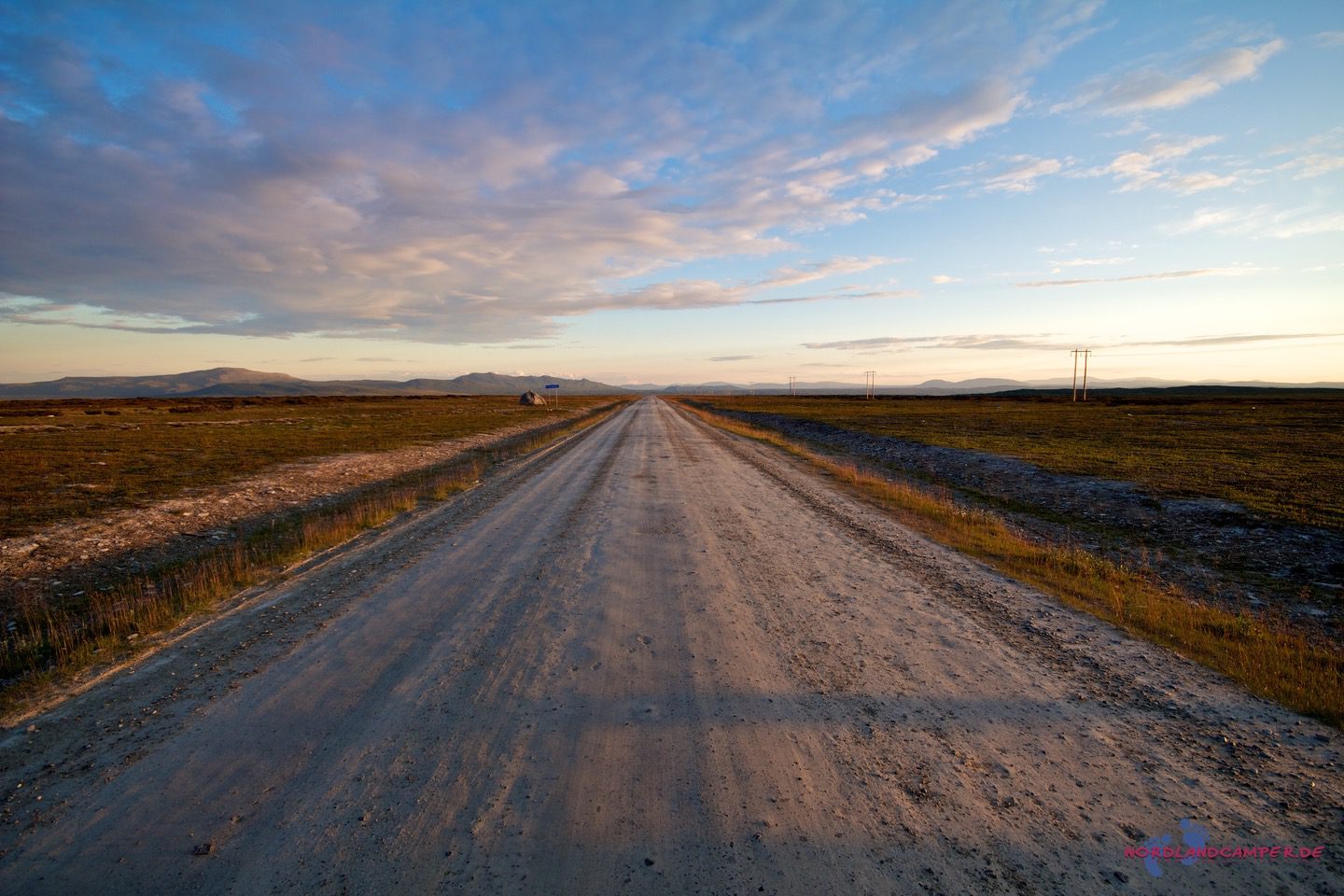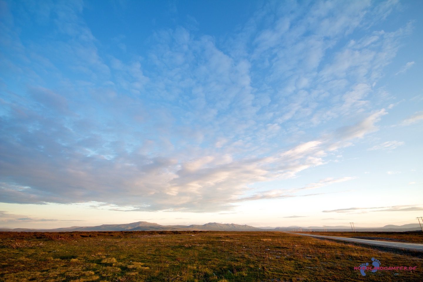 Ist man erstmal auf der Passhöhe angekommen, wird die Straßenqualität besser. Insgesamt muss man mit knapp 40 Kilometern „Rumpelpiste“ rechnen, bis die Reifen wieder Asphalt unter sich haben. Die Aussicht ist gigantisch und reicht bis zum Horizont. In seiner Kargheit ist dieser Flecken Natur extrem einladend. Nach einigen Kilometern auf Passhöhe erreicht man die Mitte des Flatruetvägen, der durch einen großen Gedenkstein und einen entsprechenden Parkplatz markiert ist. Hier ist der optimale Platz zum Übernachten! Wenn das Wetter schlecht ist, pfeift der Wind gehörig um das Wohnmobil und der Regen prasselt stramm aufs Dach. Auf dem weiten Hochplateau gibt es nichts, was dem Wind etwas entgegensetzen kann. Bei Mistwetter sollte man sich also die Fahrt hier hinauf gut überlegen.