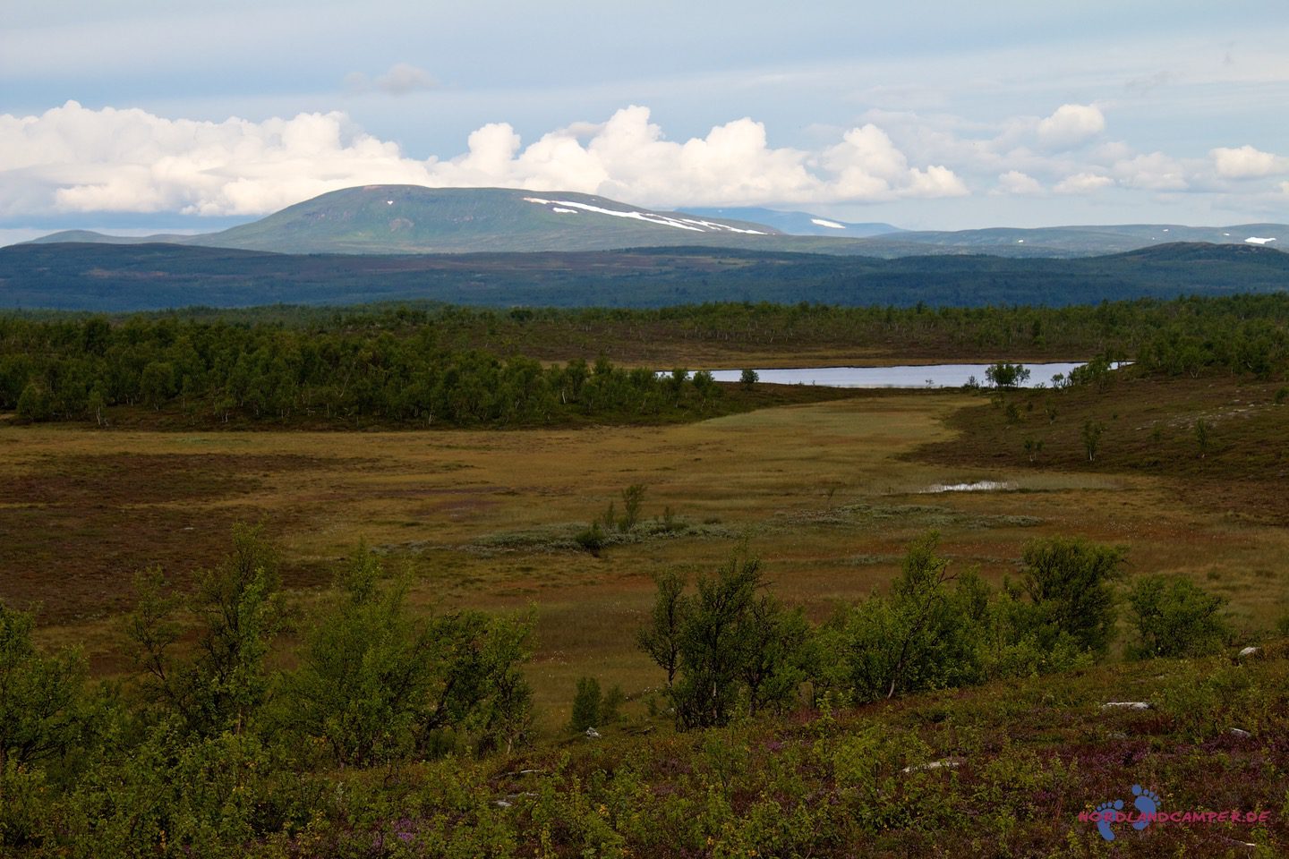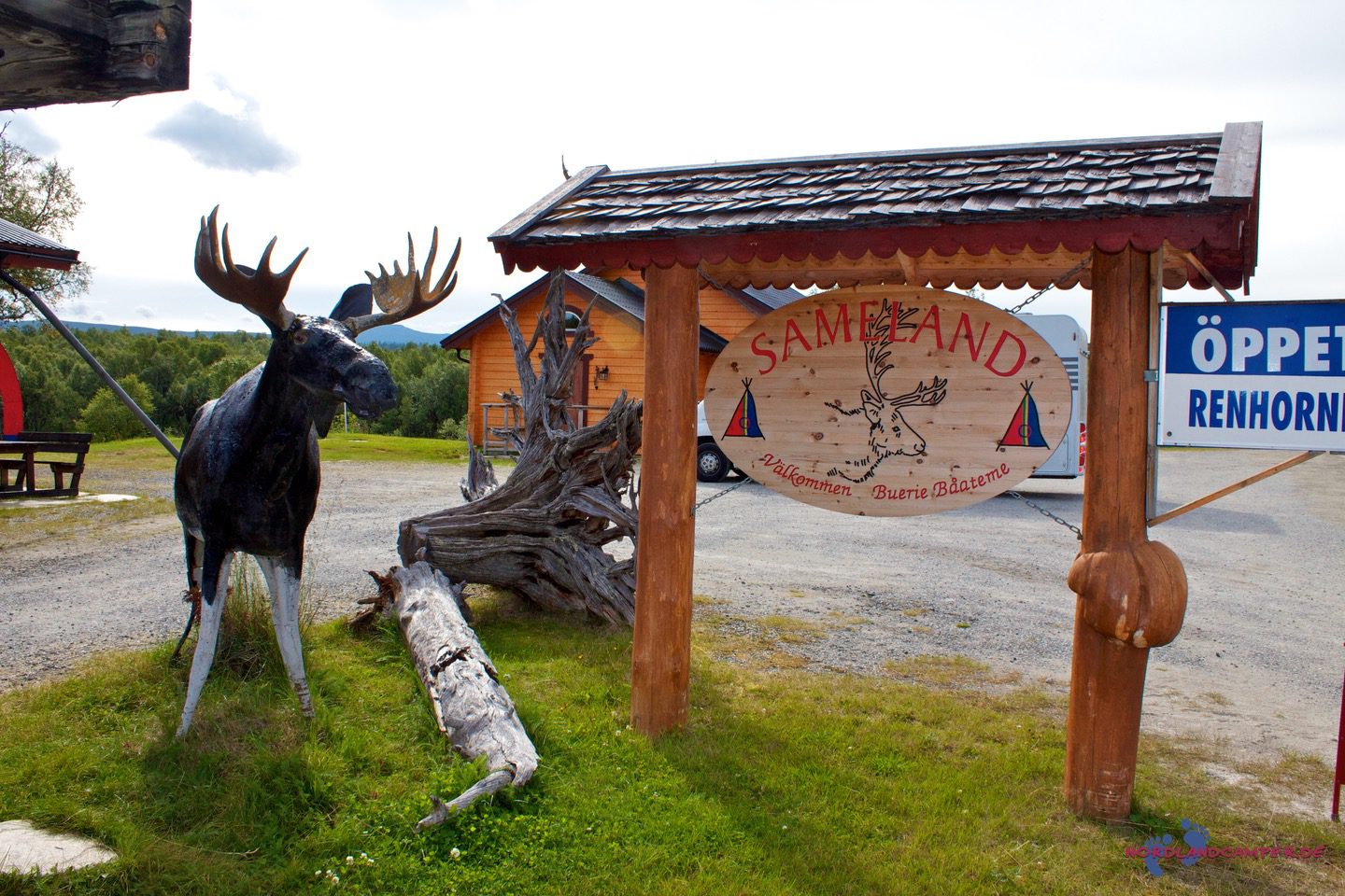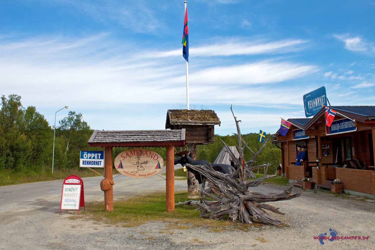 Vom Parkplatz aus, der nun leicht abfallenden Straße noch einige Kilometer Richtung Süden folgend, erreichen wir Mittådalen (Link bei Facebook, schwedische Homepage von Mittådalen), ein Dorf der Sami. Hier leben noch ganze 50 Einwohner, die allesamt von der Rentierzucht leben. Entsprechend viele Tier kann man hier aus der Nähe bewundern. Zentrum ist ein Kiosk, in welchem man leckere Spezialitäten der Region (Rentier-/Elchfleisch, Beeren, Pilze, Fisch) und einige Souvenirs erwerben kann. Toll sind auch die feinen handgefertigten Einzelstücke wie z.B. Sami-Messer. Wer ansonsten seine Lebensmittelvorräte hier auffrischen möchte hat Pech gehabt – einen Lebensmittelladen gibt es nicht. Im Gastraum kann man dafür aber ein beeindruckendes Bärenfäll bestaunen. Hinter dem Kiosk können Kinder eine Torfkota von innen bestaunen. Frisch gestärkt kann nun die Fahrt durch die weitläufige Natur weitergehen.