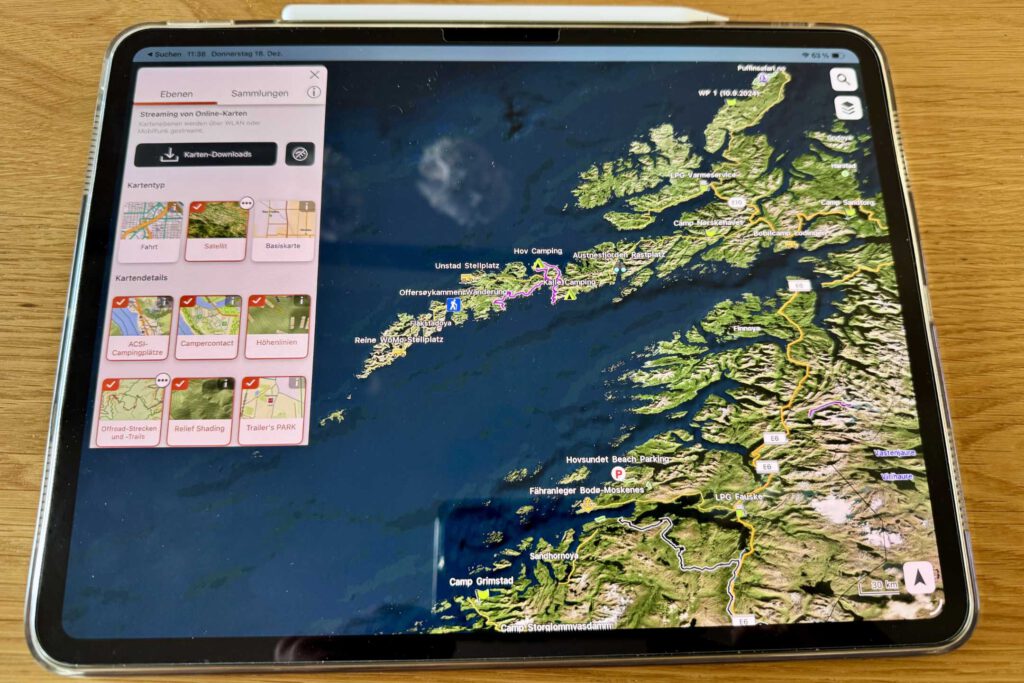 BirdsEye-Satellitenbilder laden nun direkt aufs Gerät per WLAN herunter, damit Du Camps oder Wasserstellen aus der Vogelperspektive zoomst, und integrierte Datenbanken wie ACSI oder Campercontact zeigen tausende Stellplätze direkt an, ohne dass Du Apps wechseln musst. Der Track-Recorder zeichnet jede Fahrt lückenlos auf und exportiert sie als GPX-Datei, die Du später mit Tools wie Wikiloc oder Komoot aus unseren Top-Apps teilst oder analysierst.