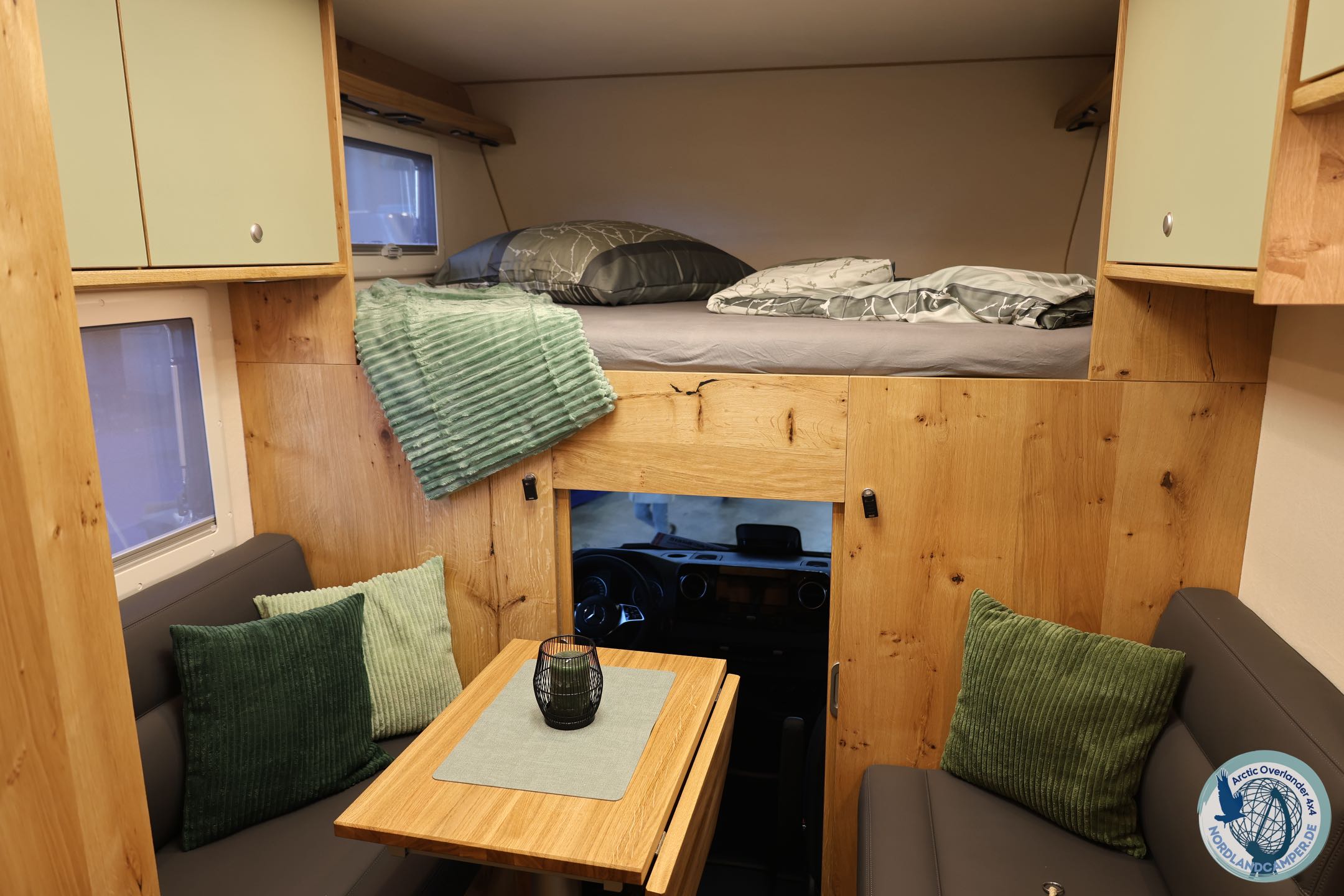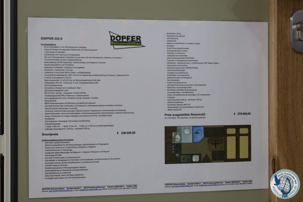 Du navigierst mit dem Dopfer 332A Granit über schmale Straßen, enge Kurven und Schotterpisten, ohne dich eingeengt zu fühlen. Bei 6 Metern Länge, 2,2 Metern Breite und 3,3 Metern Höhe passt er auf jede Fähre und enge Parkplätze, während der Allradantrieb vom Mercedes Sprinter 419 CDI Traktion auf Schnee, Schlamm und Kies bietet. Der mattschwarze Frontbügel mit LED-Scheinwerfern und die Delta-Alufelgen mit 265er Reifen verstärken den Offroad-Look und verbessern die Stabilität.