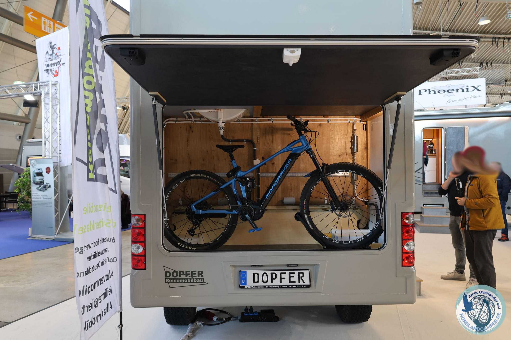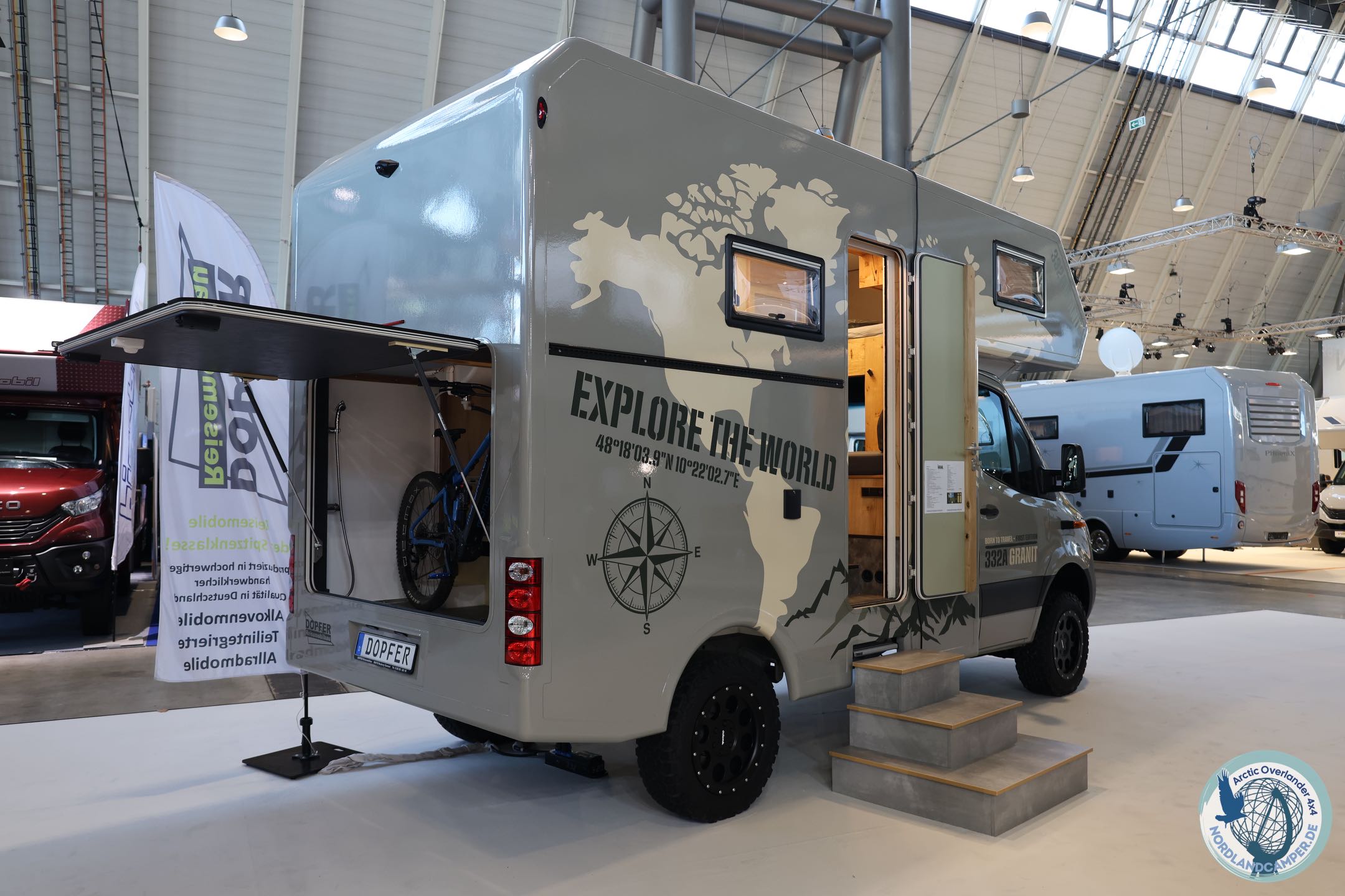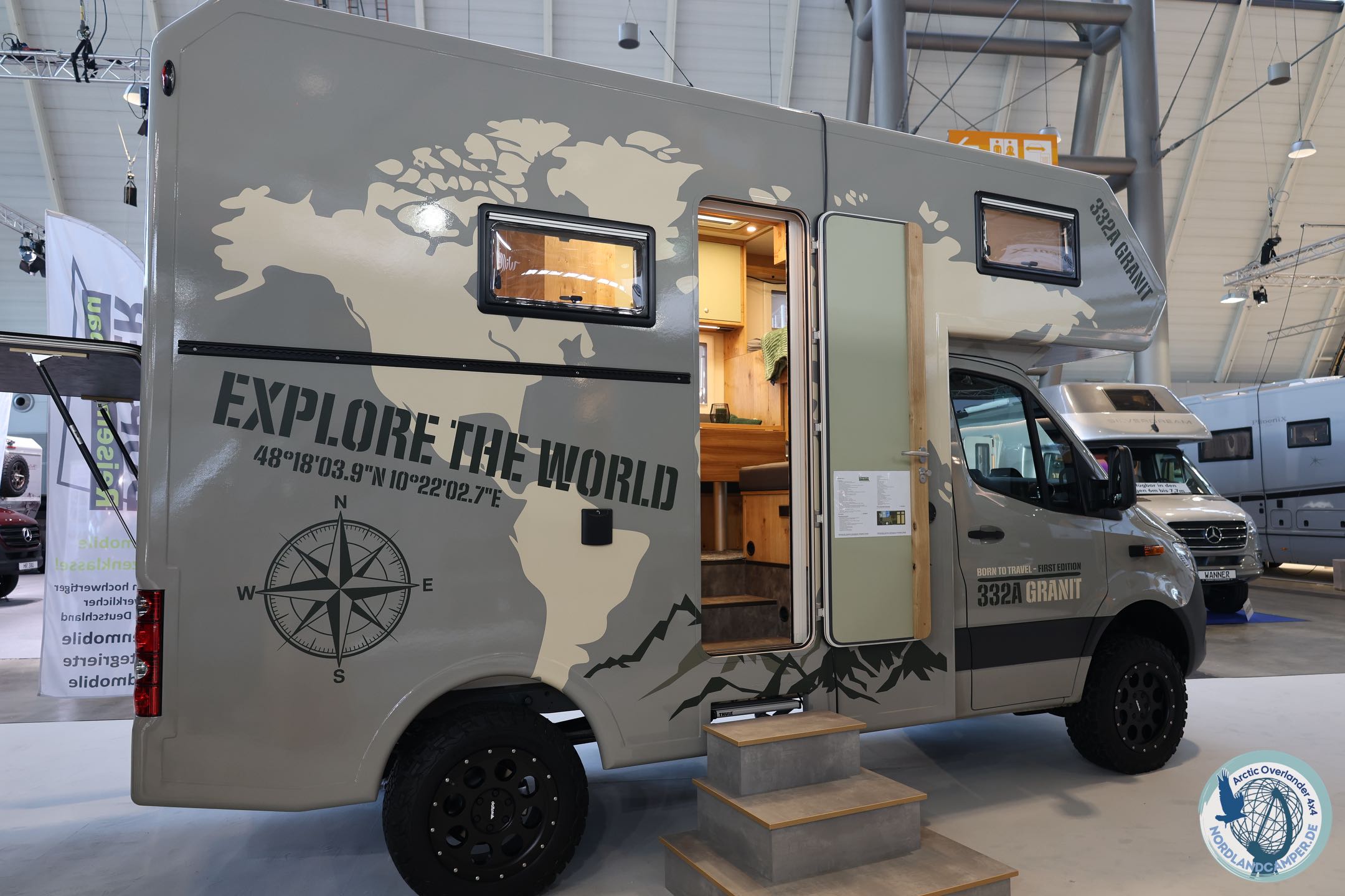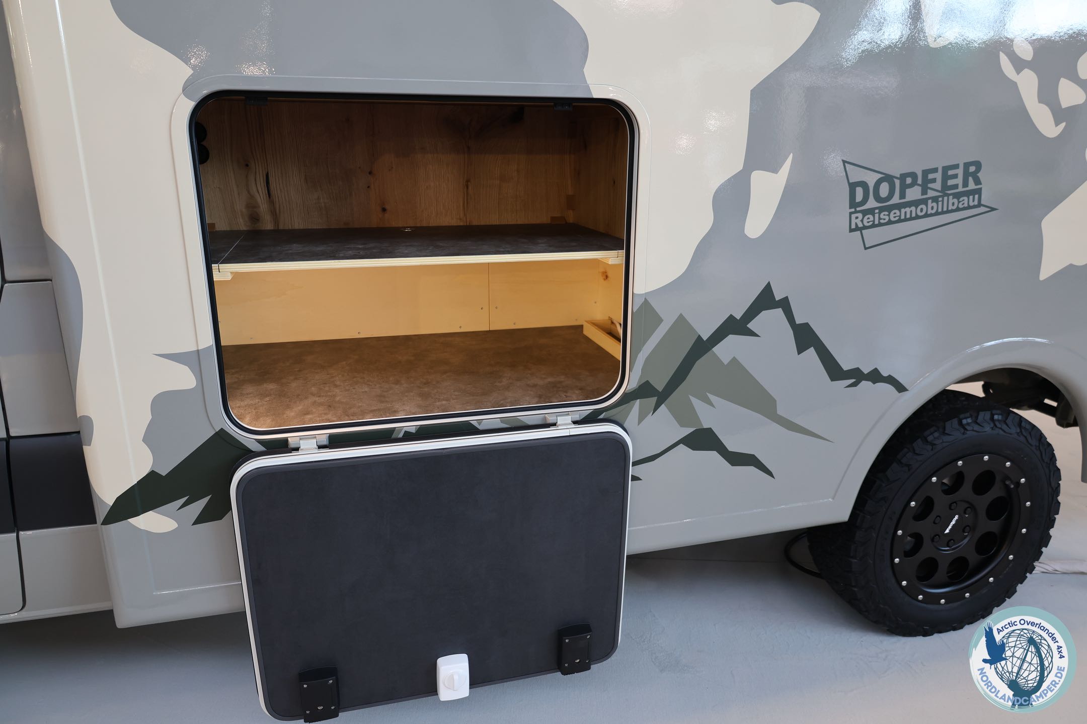 Die elektrisch einfahrbare Trittstufe verschwindet im Gelände, und der isolierte Doppelboden schützt das Fahrzeug vor Frost in klirrenden nordischen Nächten. Zwei Fahrräder und weiteres Equipment finden Platz in der beheizten Heckgarage.