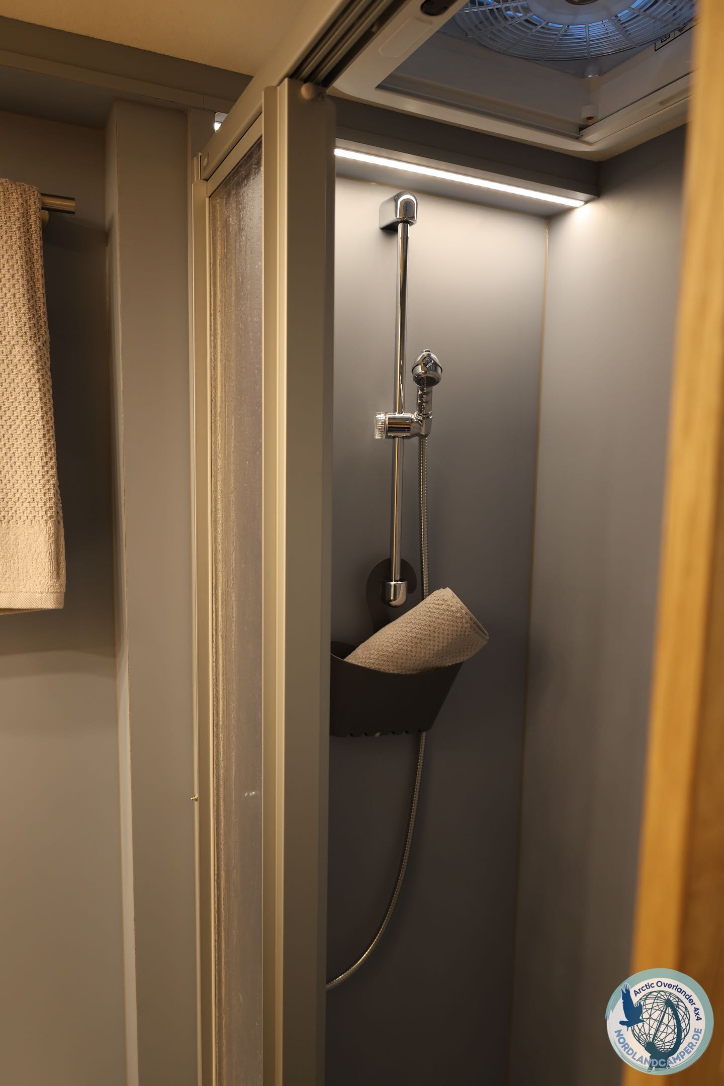 In der großen Küche organisieren Schubläden mit Fächern, ein Müllsystem und Flaschenhalter deine Vorräte. Der 130-Liter-Kompressorkühlschrank hält Deine Lebensmittel frisch. Das abgetrennte Bad mit separater großer Duschkabine bietet Privatsphäre nach langen Wanderungen. Viele Oberschränke sorgen für ausreichend Staumöglichkeiten auch im Innenraum.
