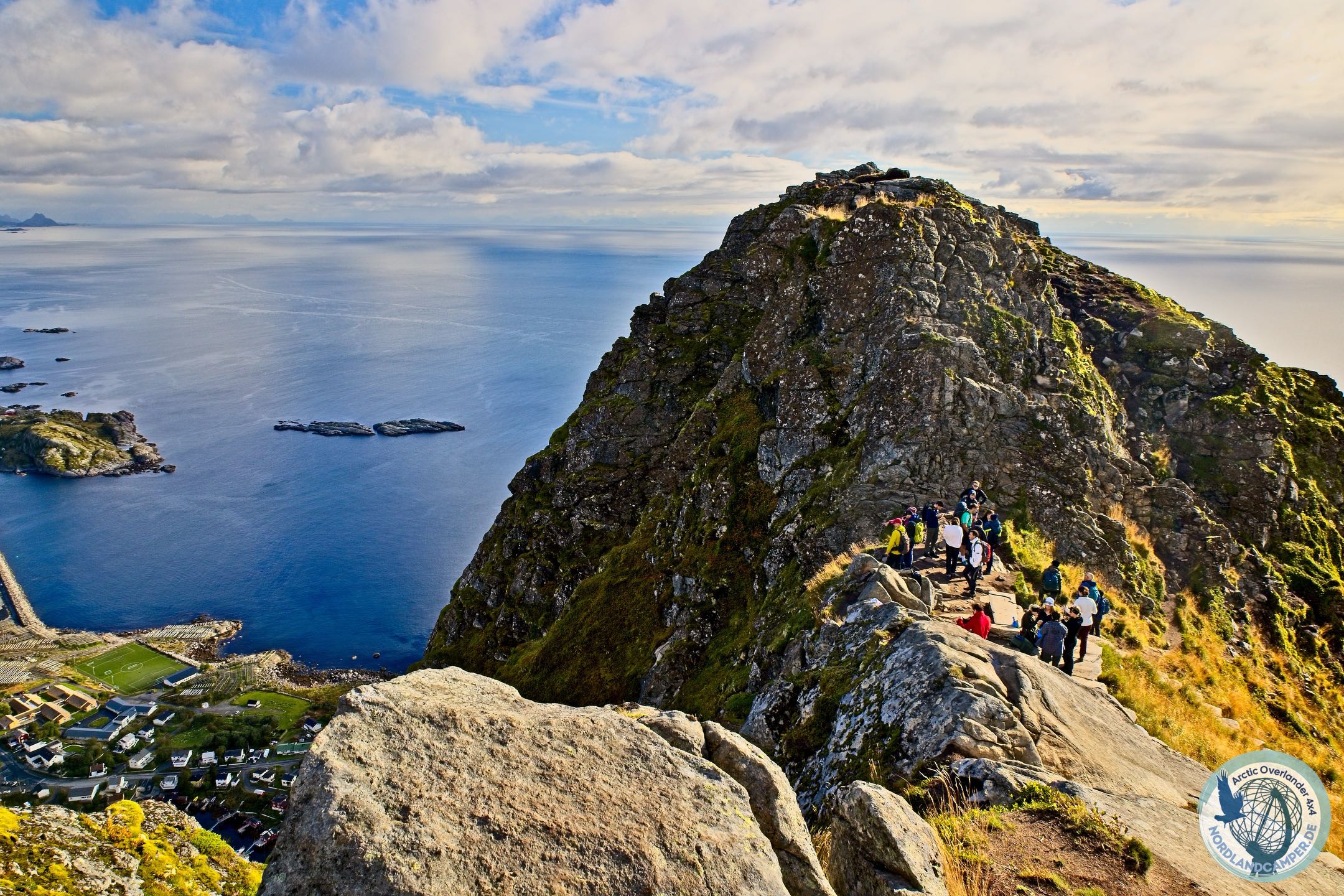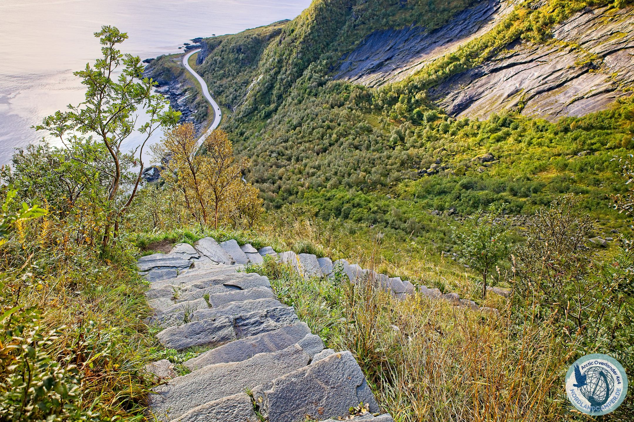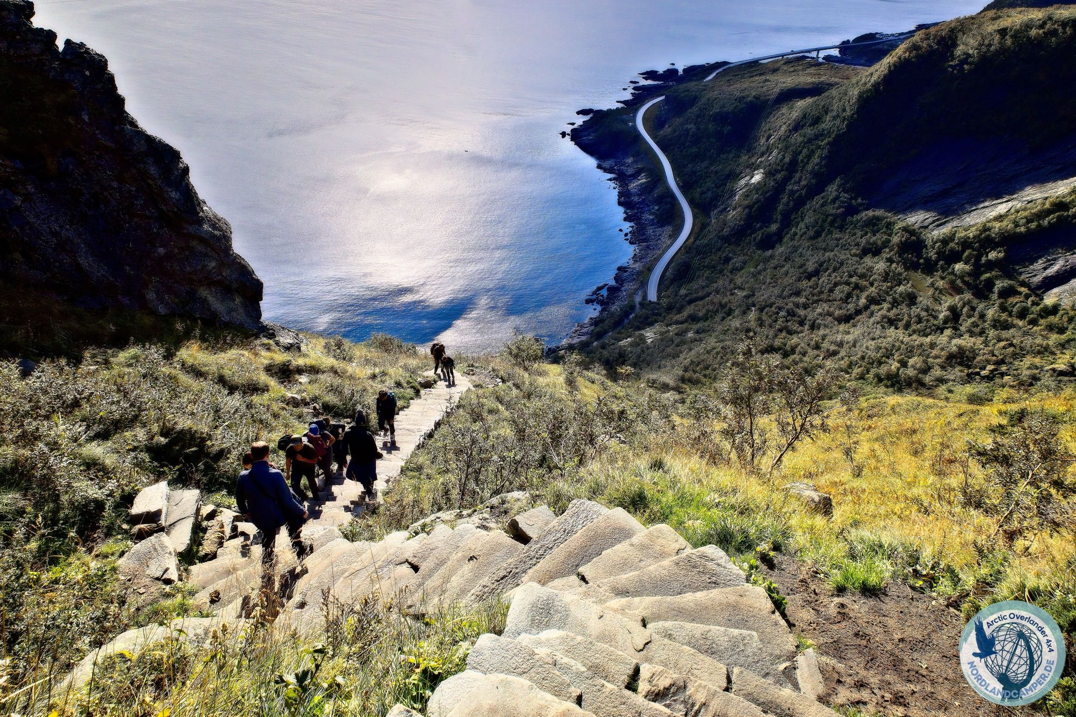 Der Berg Reinebringen thront direkt über dem Dorf Reine, das mit etwa 700 Einwohnern eines der ikonischsten Postkartenmotive Norwegens darstellt. Der Aufstieg misst etwa 3-4 Kilometer hin und zurück, mit über 400 Höhenmetern, die größtenteils über eine endlose Kette von Steinstufen gemeistert werden – eine “Sherpa-Treppe”, die von eigens eingeflogenen nepalesischen Sherpas geschaffen wurde. Der ursprüngliche, sehr ausgesetzte und rutschige Pfad, führte zu häufigen Unfällen und vielen Todesopfern, weshalb die Treppe geschaffen wurde.