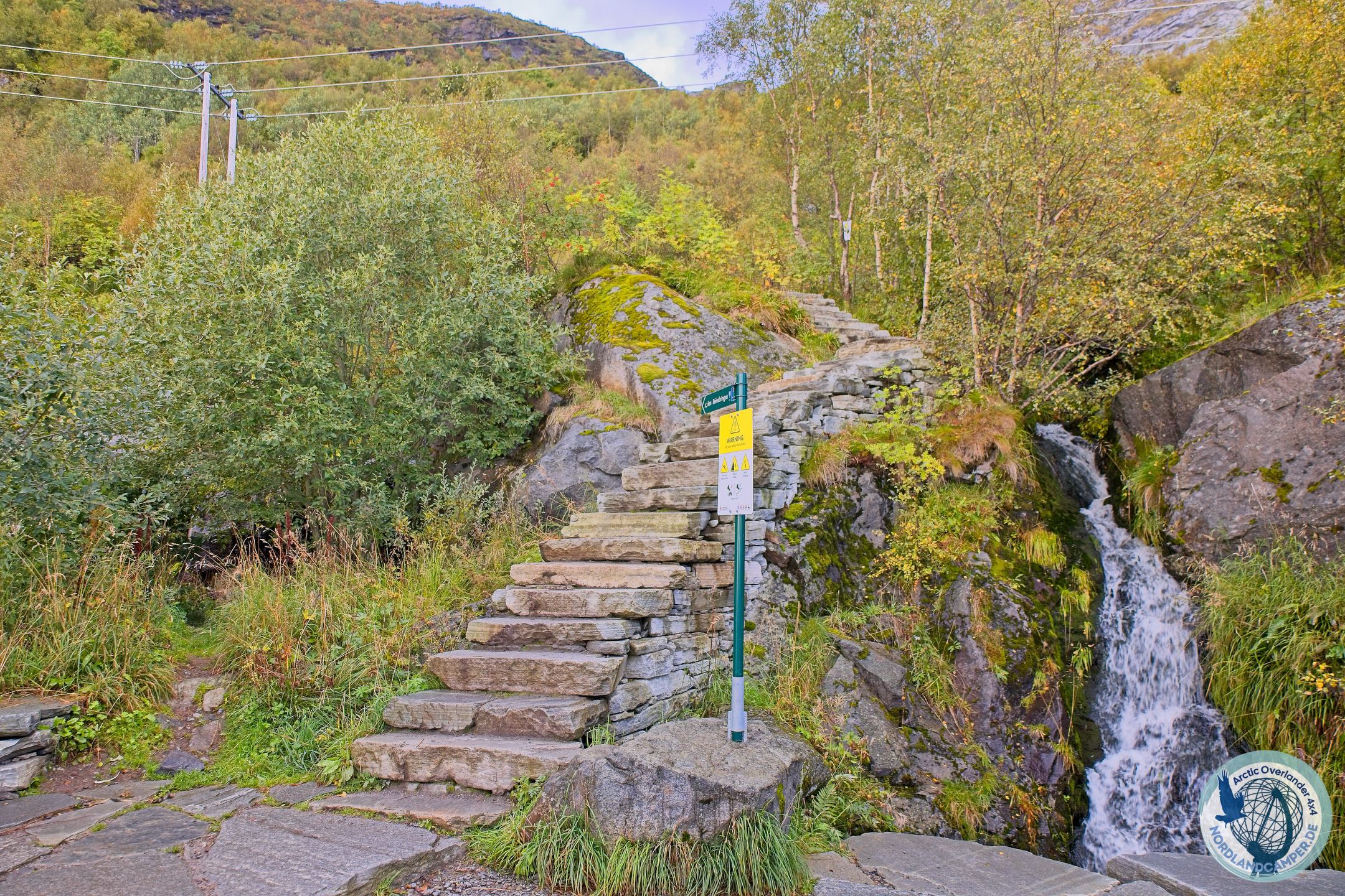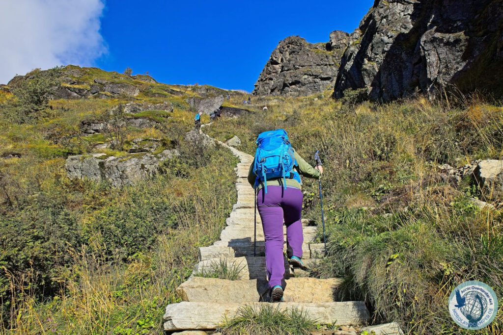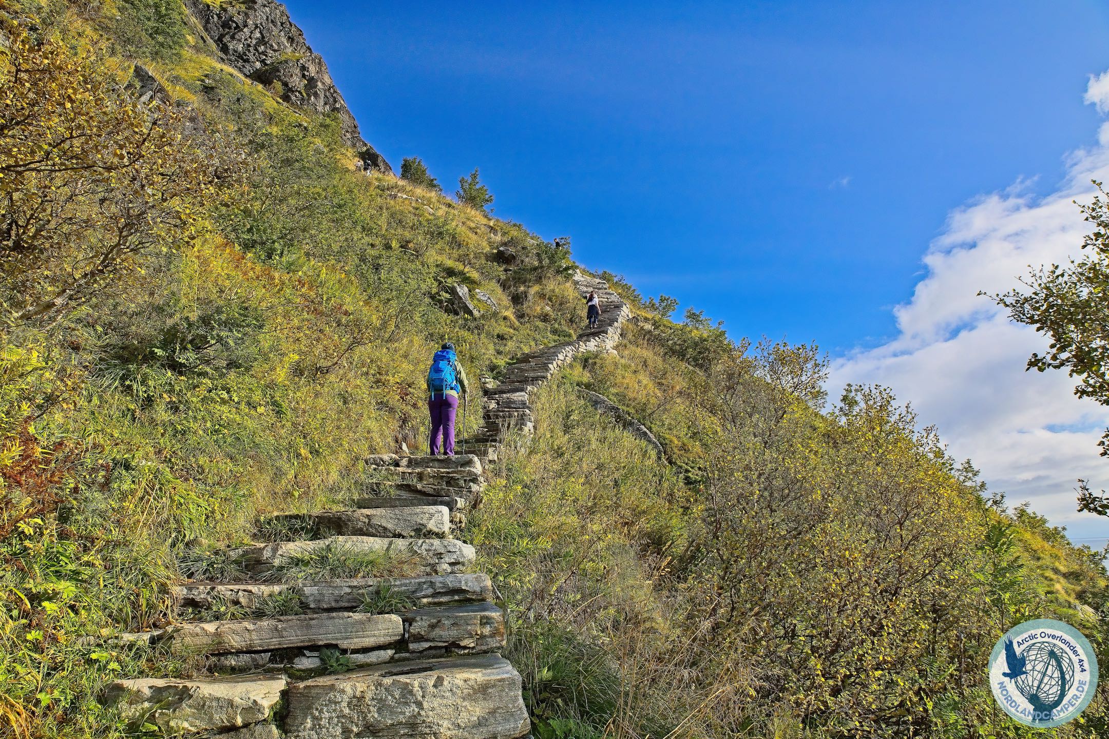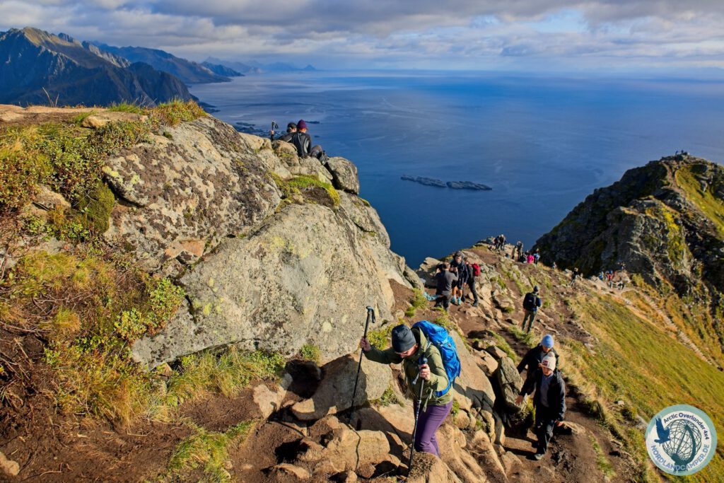 Der Berg Reinebringen thront direkt über dem Dorf Reine, das mit etwa 700 Einwohnern eines der ikonischsten Postkartenmotive Norwegens darstellt. Der Aufstieg misst etwa 3-4 Kilometer hin und zurück, mit über 400 Höhenmetern, die größtenteils über eine endlose Kette von Steinstufen gemeistert werden – eine “Sherpa-Treppe”, die von eigens eingeflogenen nepalesischen Sherpas geschaffen wurde. Der ursprüngliche, sehr ausgesetzte und rutschige Pfad, führte zu häufigen Unfällen und vielen Todesopfern, weshalb die Treppe geschaffen wurde.