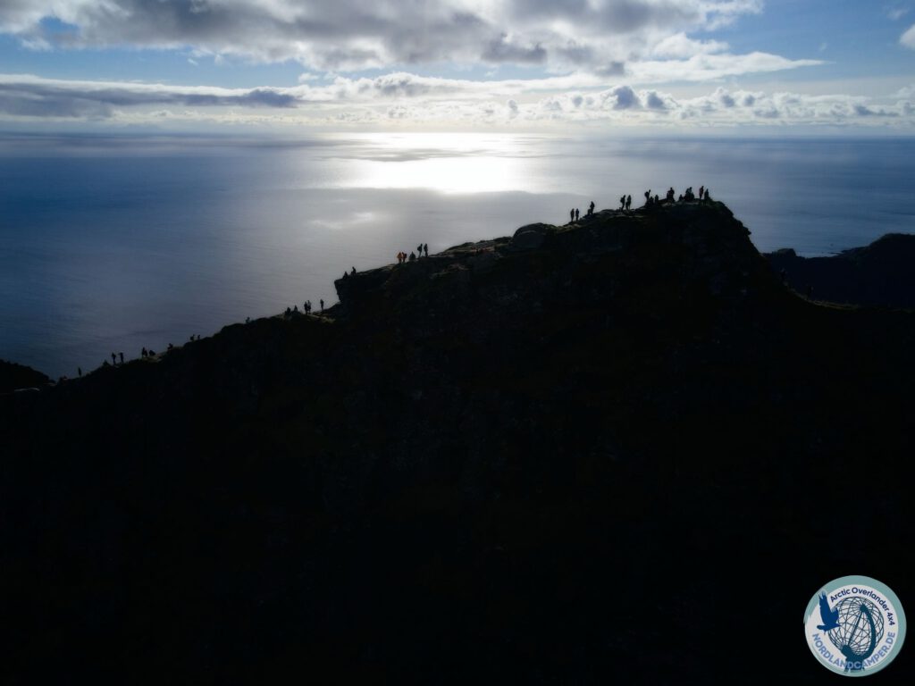 Der finale Anstieg führt über einen scharfen Grat, an dem es hunderte Meter senkrecht nach unten geht; der Wind peitscht, das Adrenalin steigt. Oben auf 448 Metern öffnet sich das Panorama: Reine tief unter Dir, majestätisch die Inselkette der Lofoten um Dich herum, Sakrisøy und Hamnøy mit ihren roten Hütten, die fernen Schneeberge des Festlands in Richtung Narvik. Die Mitternachtssonne taucht alles in goldenes Licht, Vögel kreischen, der Atlantik glitzert, über Dir kreist ein Seeadler. Einfach episch!