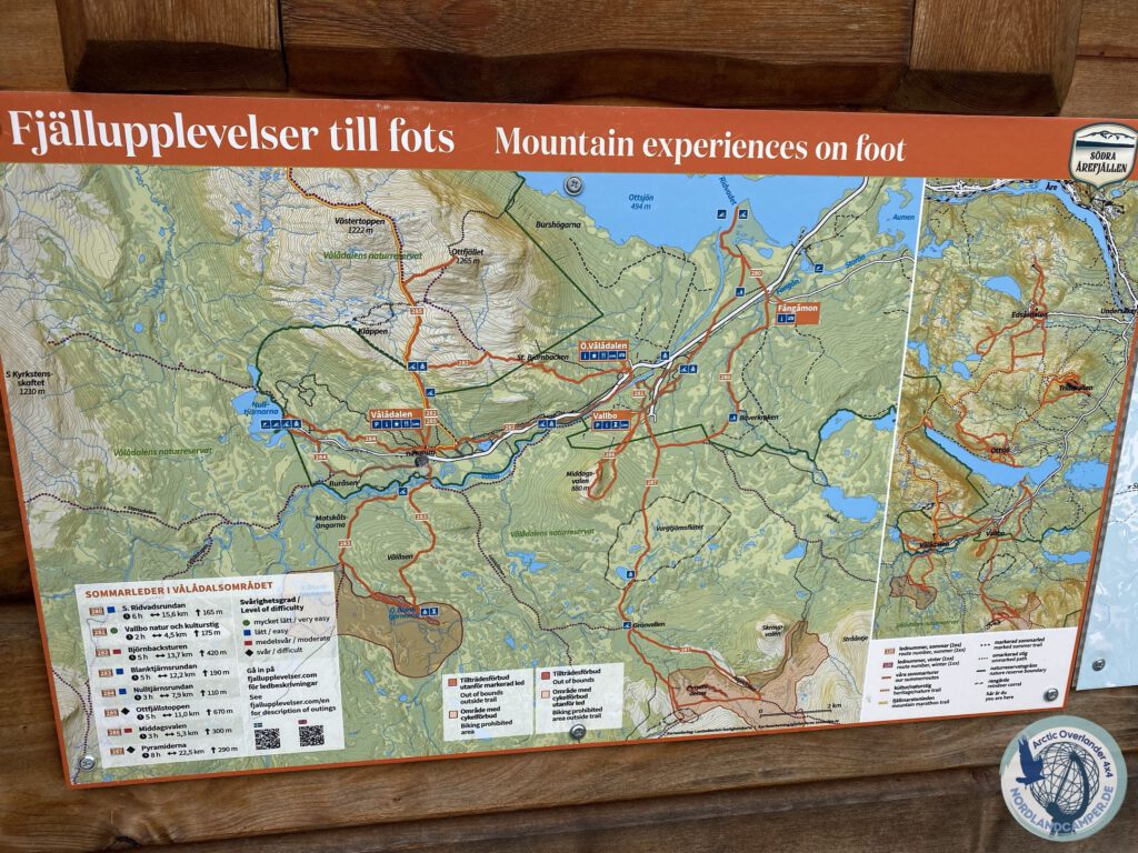 Direkt am Ende der Straße, wo auch die Wanderwege beginnen, liegt die historische Våladalens Fjällstation, der zentrale Knotenpunkt für alle Outdoor-Aktivitäten in der Region. Der dortige große Parkplatz darf nicht zum übernachten genutzt werden. Wer die Straße jedoch weiter bis zum Ende fährt, erreicht einen großen geschotterten Parkplatz an einem See. Hier darf übernachtet werden und war bei unserem letzten Besuch kostenlos.