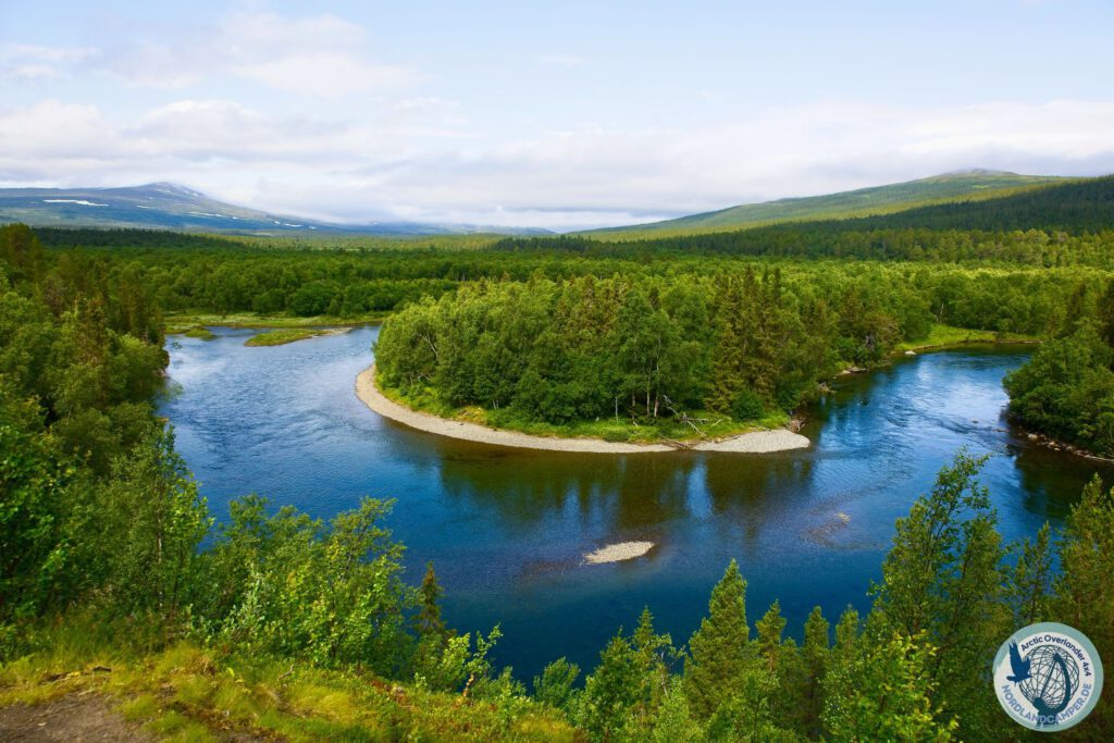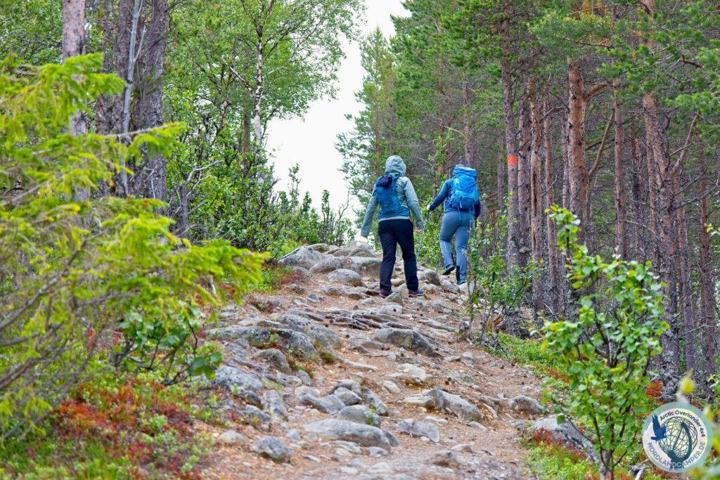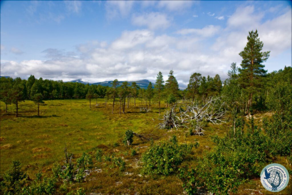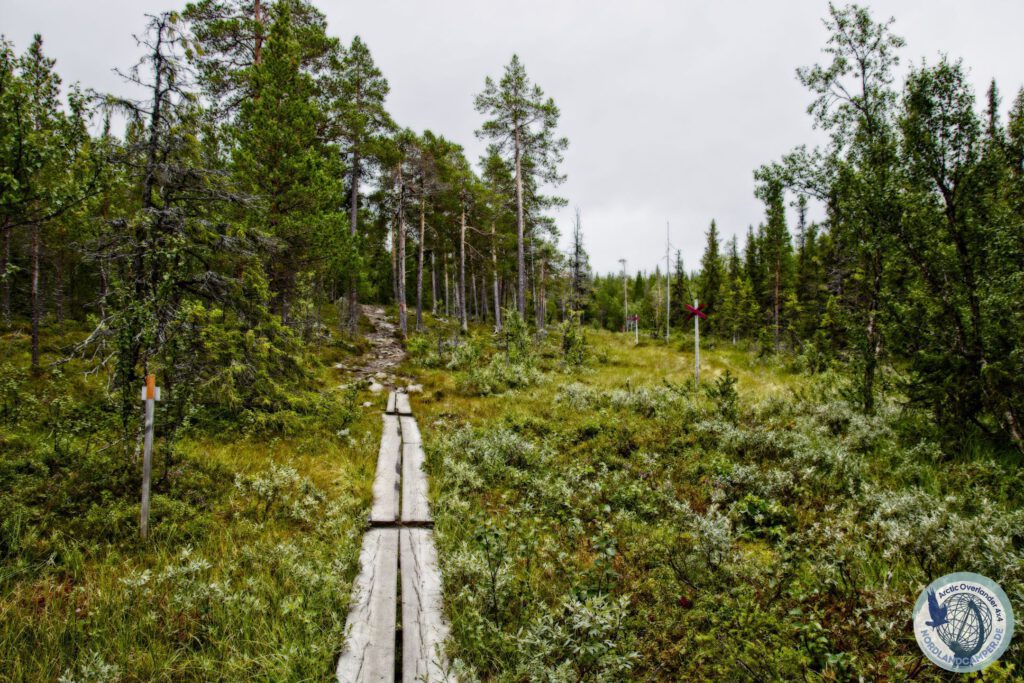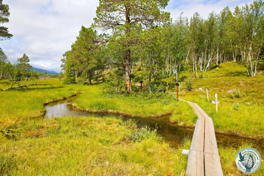 Die Landschaft verändert sich nun rapide. Aus dem offenen Flusstal wird ein immer dichter werdender Wald, in dem knorrige Wurzeln den schmalen Pfad durchziehen. Hier zeigt sich, warum festes Schuhwerk mit einer griffigen Sohle absolute Pflicht ist. Der Weg führt stetig, aber moderat bergauf. Immer wieder weicht der Wald auf und gibt den Blick über weite, offene Moorflächen frei. Um diese fragilen und feuchten Ökosysteme zu schützen – und um den Wanderern trockene Füße zu garantieren – wurden hier hölzerne Stege, die sogenannten Spänger, verlegt. Das monotone Klappern der Wanderschuhe auf dem Holz, umgeben von der weiten Stille der Moore, ist ein absolut meditatives Erlebnis, das man so nur im hohen Norden Skandinaviens findet.