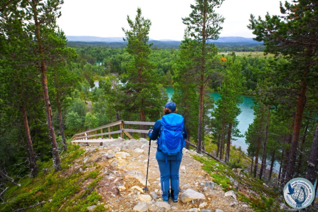 Nachdem man sich an diesem Naturwunder sattgesehen hat, führt der restliche Trail über weitere Holzstege, durch lichte Wälder und sanfte Hügel wieder stetig abwärts zurück zur Våladalens Fjällstation.