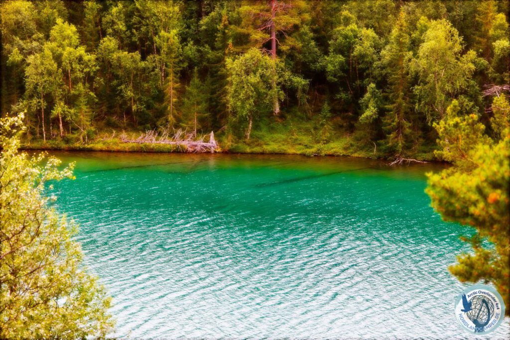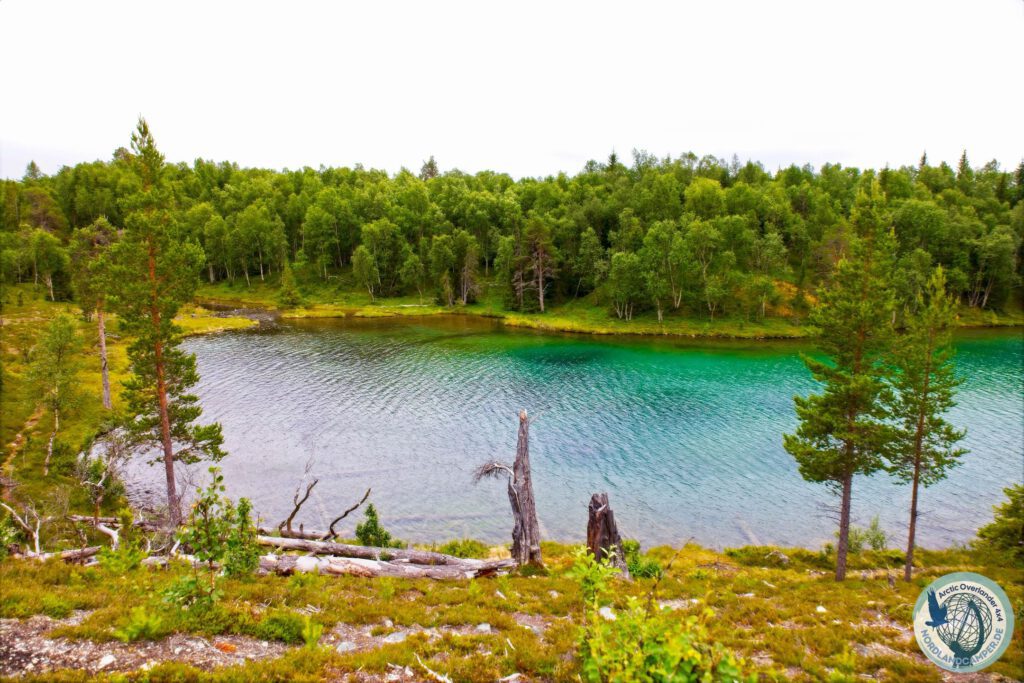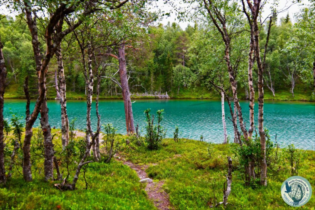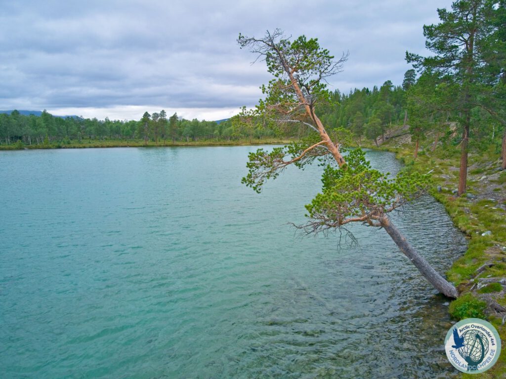 Nach gut sechs Kilometern, fast exakt auf der Hälfte der Route, liegt das Ziel unvermittelt vor einem. Wenn man aus dem dichten Wald heraustritt und den Blick in die Senke richtet, bietet sich ein Anblick, der vollkommen surreal wirkt. Inmitten der dunklen, von tiefgrünen Kiefern und braunen Mooren dominierten Landschaft liegt der Östra Blanktjärnarna – ein See, dessen Wasser in einem extrem intensiven, karibischen Türkisgrün erstrahlt. Der Kontrast zwischen der rauen schwedischen Fjäll-Umgebung und dieser leuchtenden Farboase ist so gravierend, dass man für einen Moment glauben könnte, man sei auf eine optische Täuschung hereingefallen.