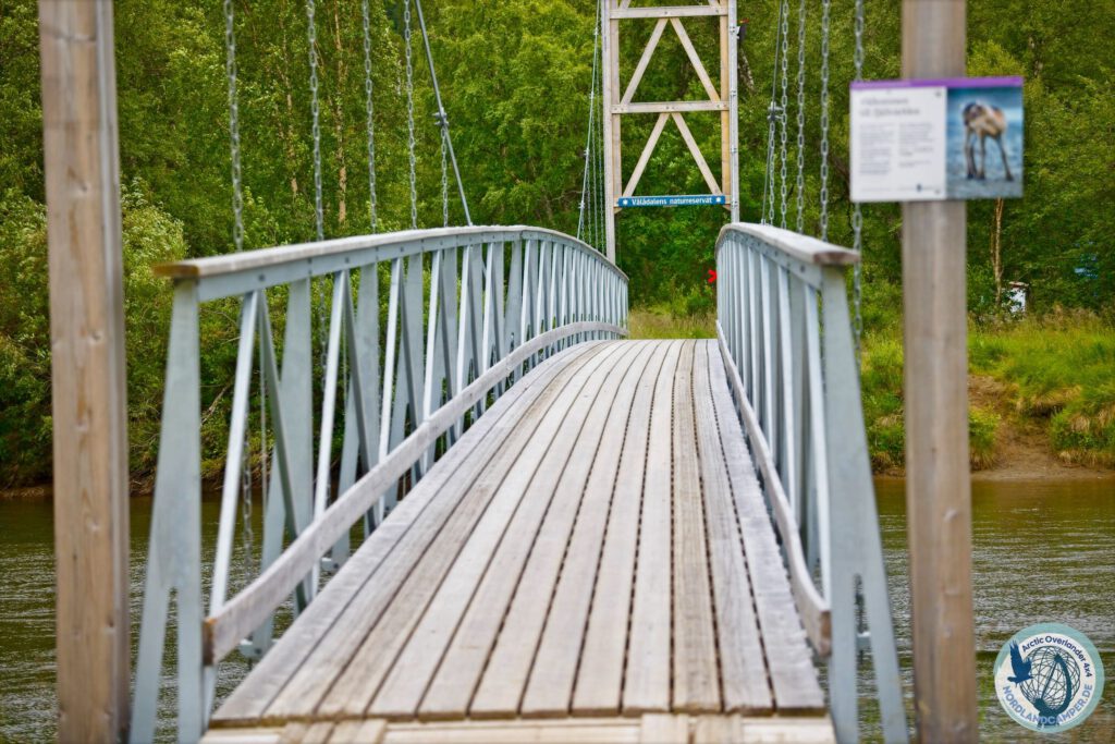 Bereits nach wenigen Kilometern durch lichten Wald erreicht man das erste architektonische und optische Highlight der Tour: eine schmale, leicht schwankende Hängebrücke, die den reißenden Fluss Vålån überspannt. Von der Mitte der Brücke aus hat man einen spektakulären Blick auf die weite Fjäll-Landschaft, während unter den Wanderstiefeln das kristallklare, kalte Wasser des Flusses hindurchströmt. Nach der Brücke wendet sich der Pfad nach rechts und folgt zunächst noch ein Stück dem Flusslauf, bevor er spürbar in die Wälder abbiegt.